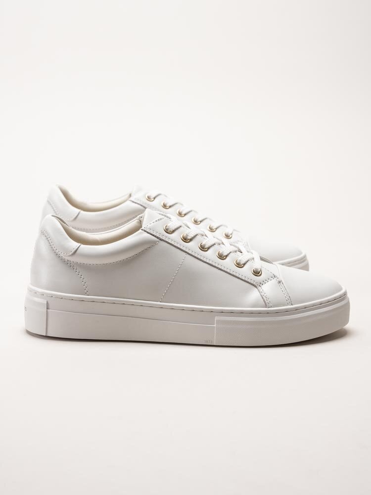 Vita sneakers i skinn Zoe från Vagabond. Skorna är tillverkade i mjukt skinn som ger ett stilrent och modernt uttryck. Den något högre plattformssulan ger en trendig look samtidigt som den bidrar till extra komfort och stabilitet. De guldfärgade öljetterna ger en elegant detalj som lyfter designen. Invändigt är modellen fodrad med textil, och den löstagbara innersulan i skinn bidrar med mjuk komfort samt möjlighet att använda egna ilägg vid behov.
