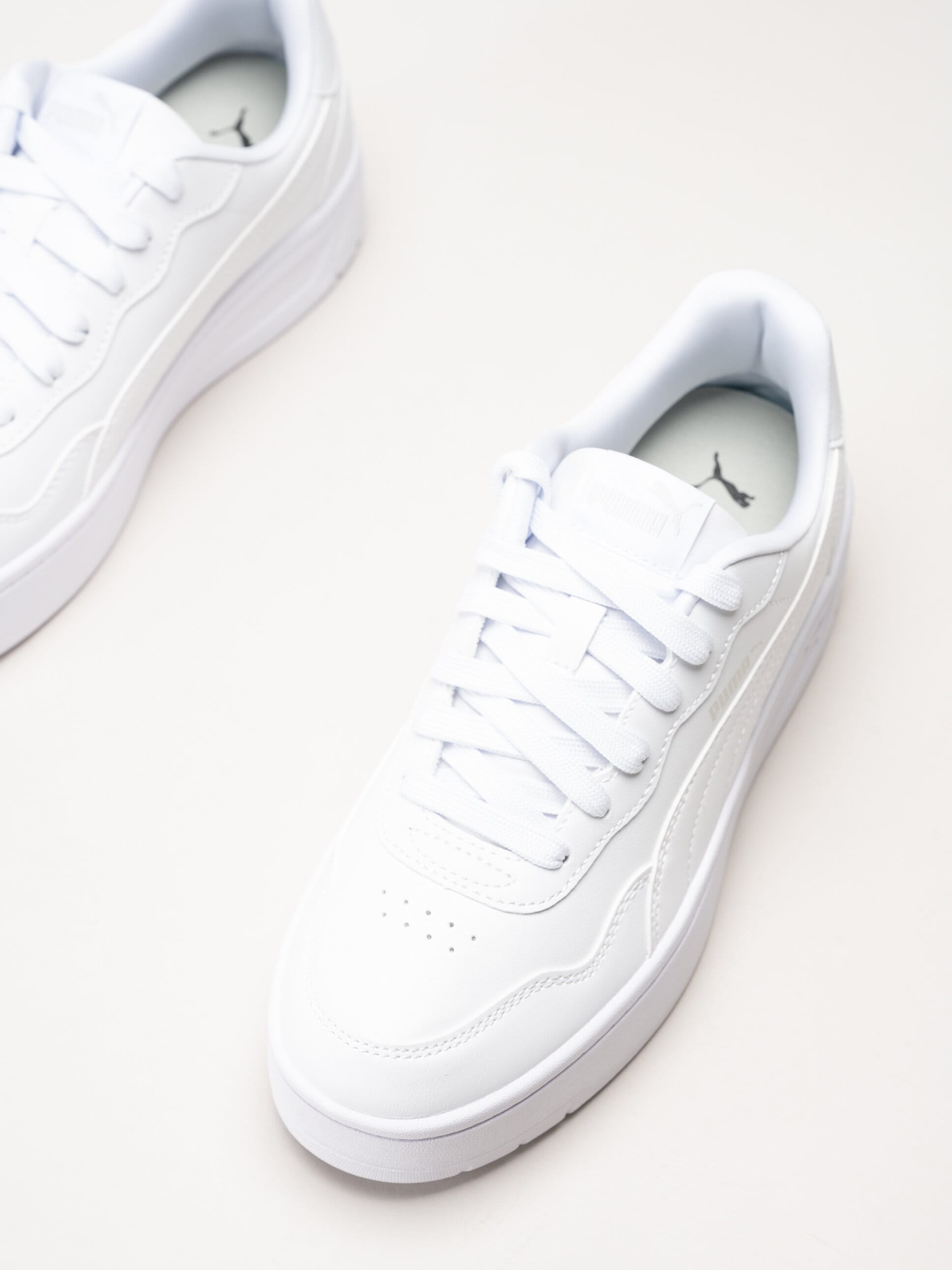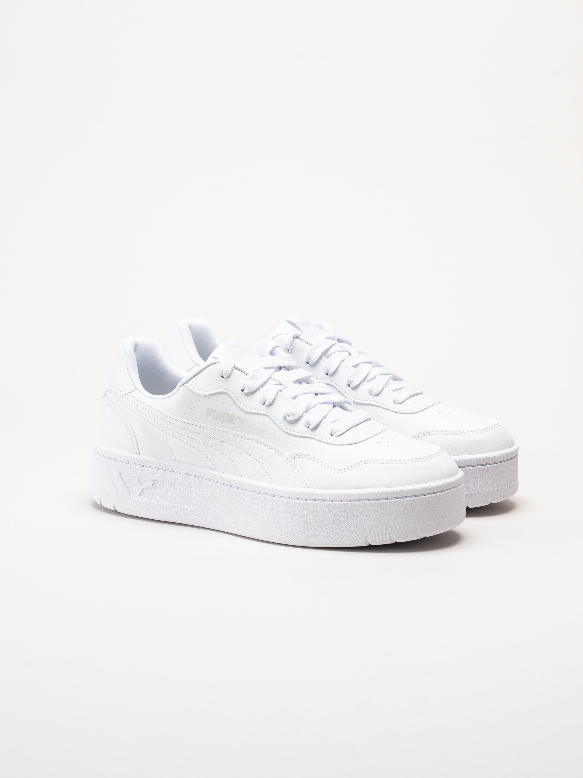 Vita platåsneakers Court Lally Skye från Puma i färgen Puma White. Skorna är tillverkade i slitstarkt syntetmaterial som ger ett sportigt och trendigt uttryck med modern design. Den höga platåsulan lyfter looken och ger en markerad silhuett.