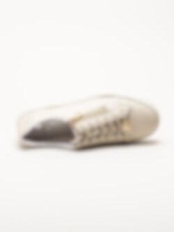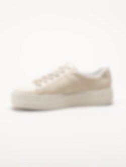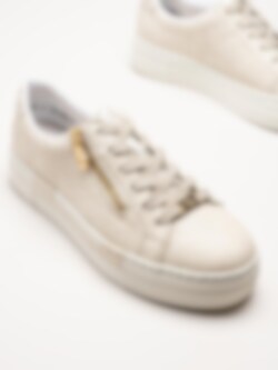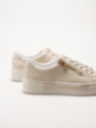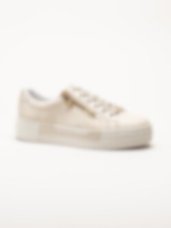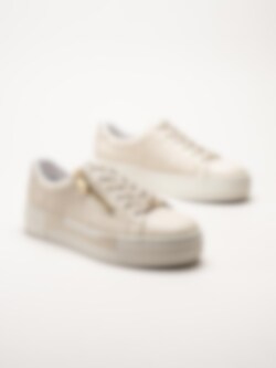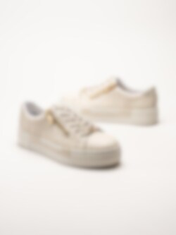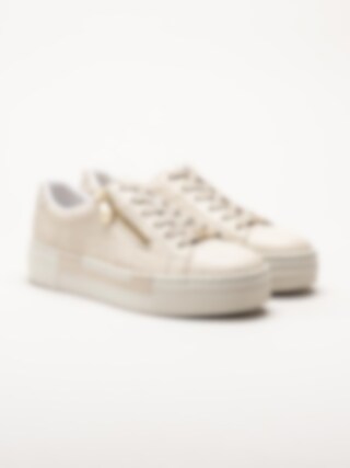 Beige platåsneakers i skinnimitation från Rieker. Höj din stil och komfort med de här trendiga platåsneakers från Rieker. Den praktiska 6-håls snörningen kombineras med en dragkedja, vilket gör på- och avtagning både enkel och snabb. Inuti hittar du ett foder i textil och en vadderad innersula i skinn som ger en mjuk och bekväm känsla hela dagen. En perfekt balans mellan mode, funktion och komfort.