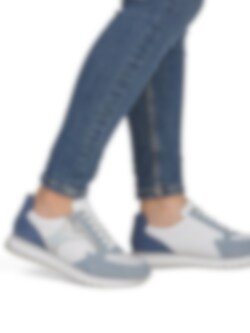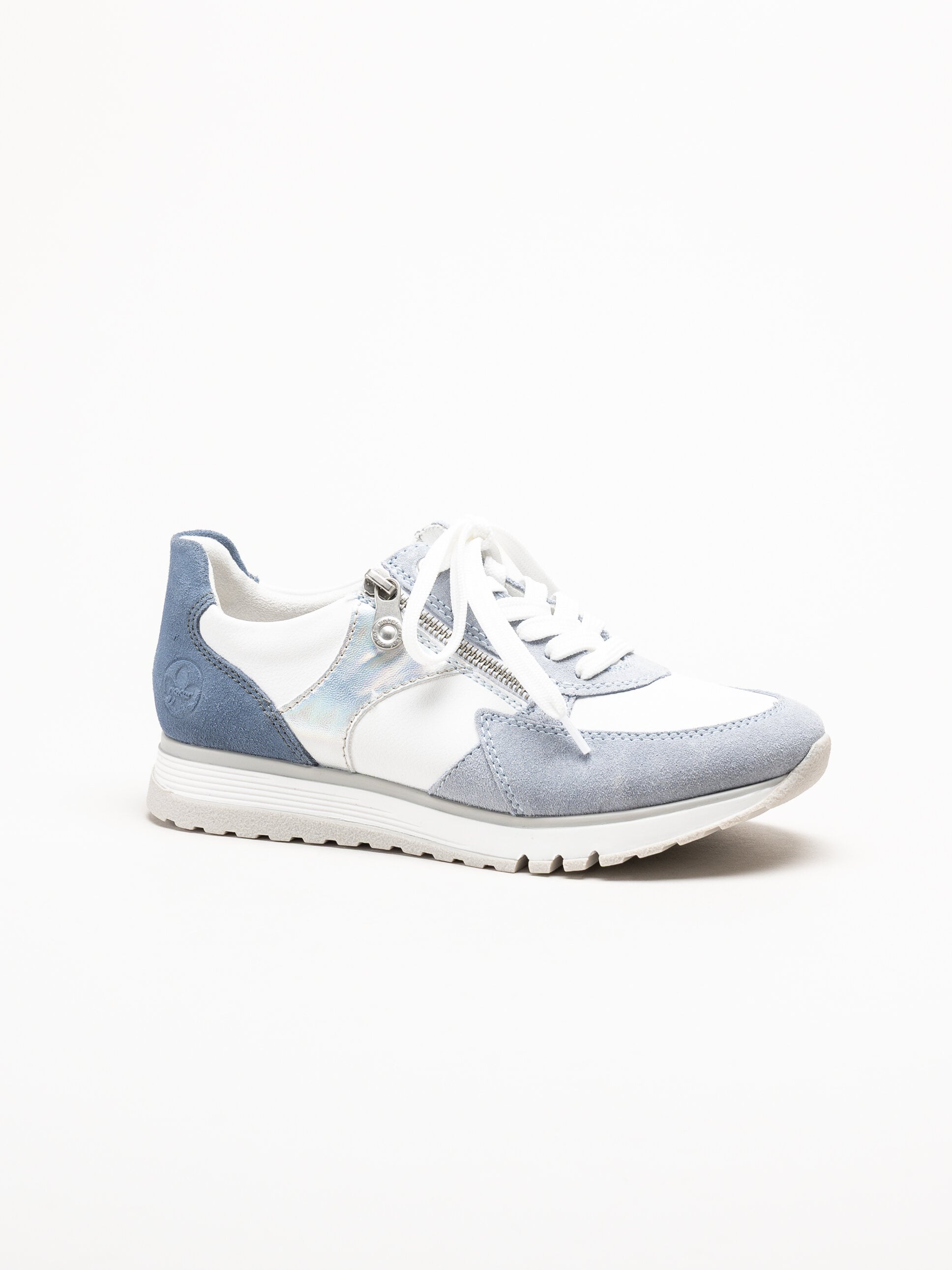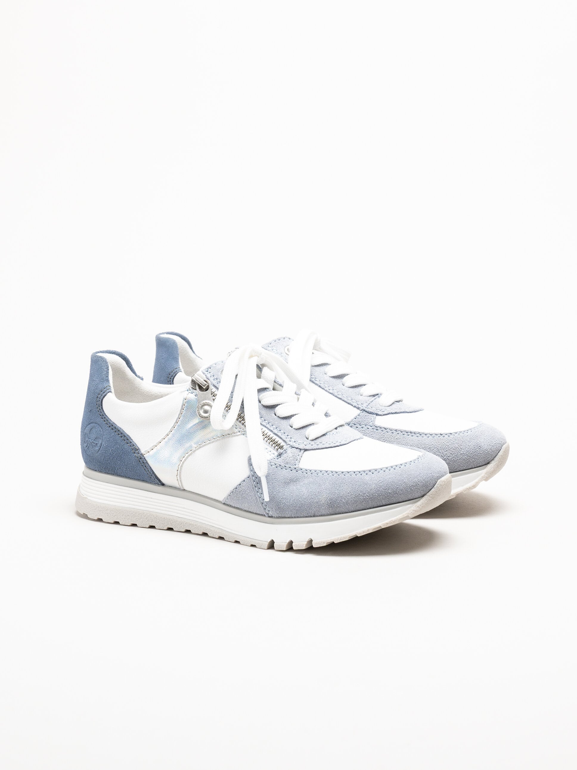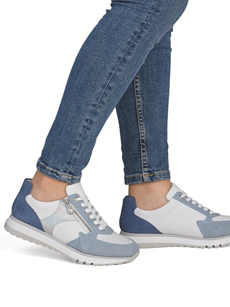 Ljusblå sneakers i mocka och skinn från Rieker i färgen Blue Combination. Skorna är tillverkade i en kombination av mjuk mocka och slitstarkt skinn som ger ett stilrent och modernt uttryck, med en design som passar både vardag och fritid.