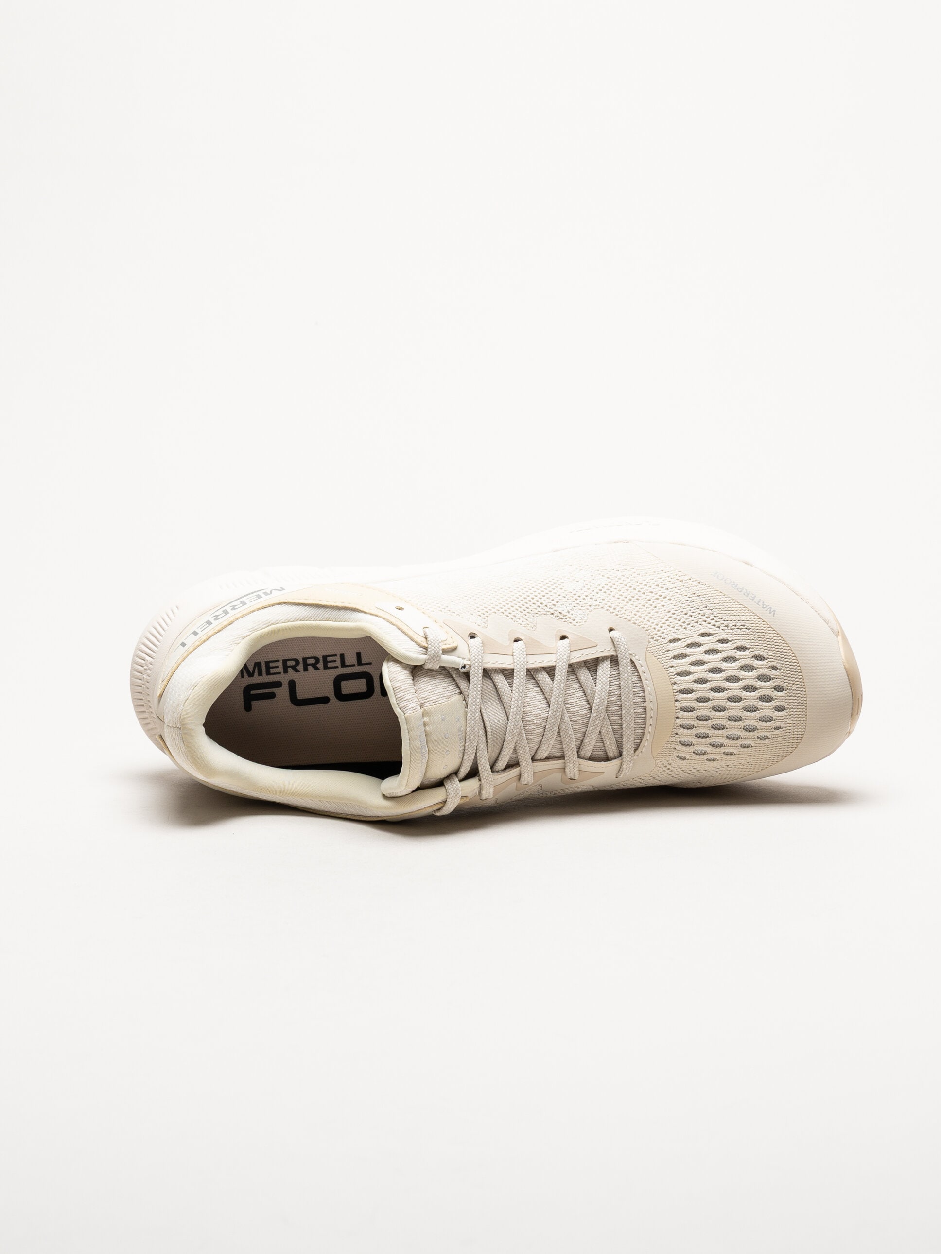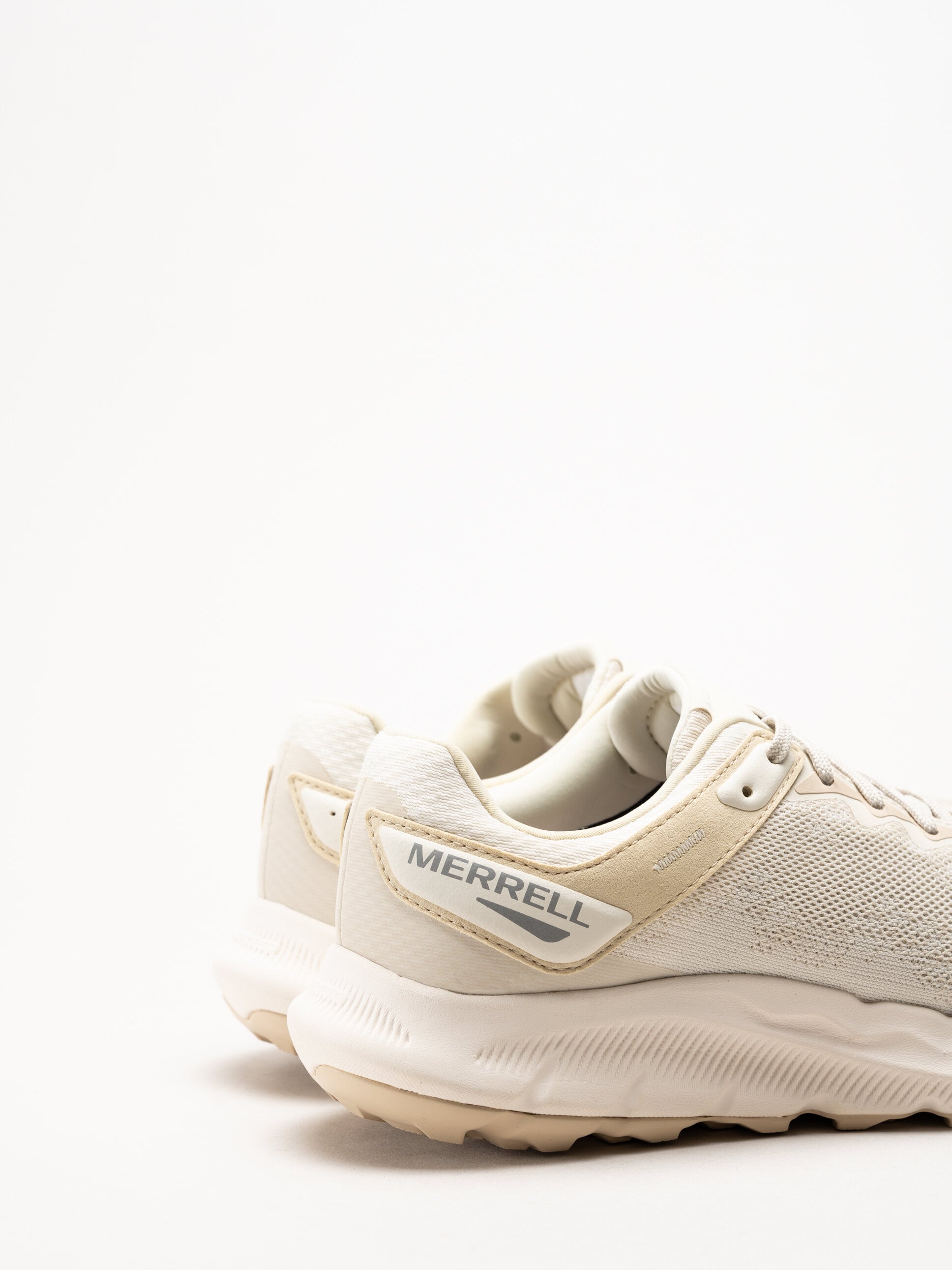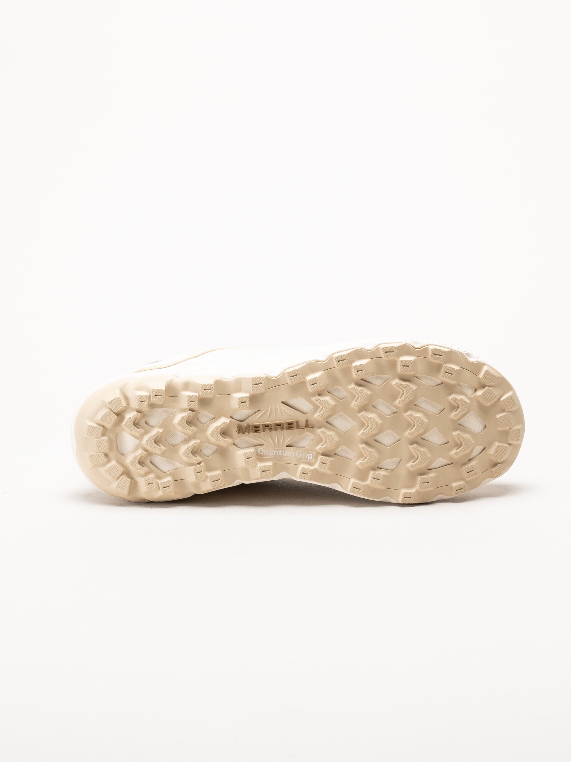 Off white sportiga sneakers Antora från Merrell i färgen Eggshell. Skorna är tillverkade i en slitstark och lätt kombination av textil och syntet som ger en modern, sportig känsla och passar perfekt för både vardag och aktiva utomhusmoment. Skorna är utrustade med ett vattentätt membran som håller fötterna torra även vid fuktiga förhållanden, samtidigt som materialet andas. Invändigt är modellen fodrad med textil, och den löstagbara innersulan i textil bidrar med komfort och möjlighet att anpassa passformen eller använda egna iläggssulor.