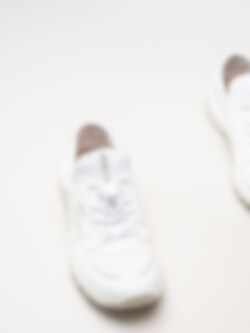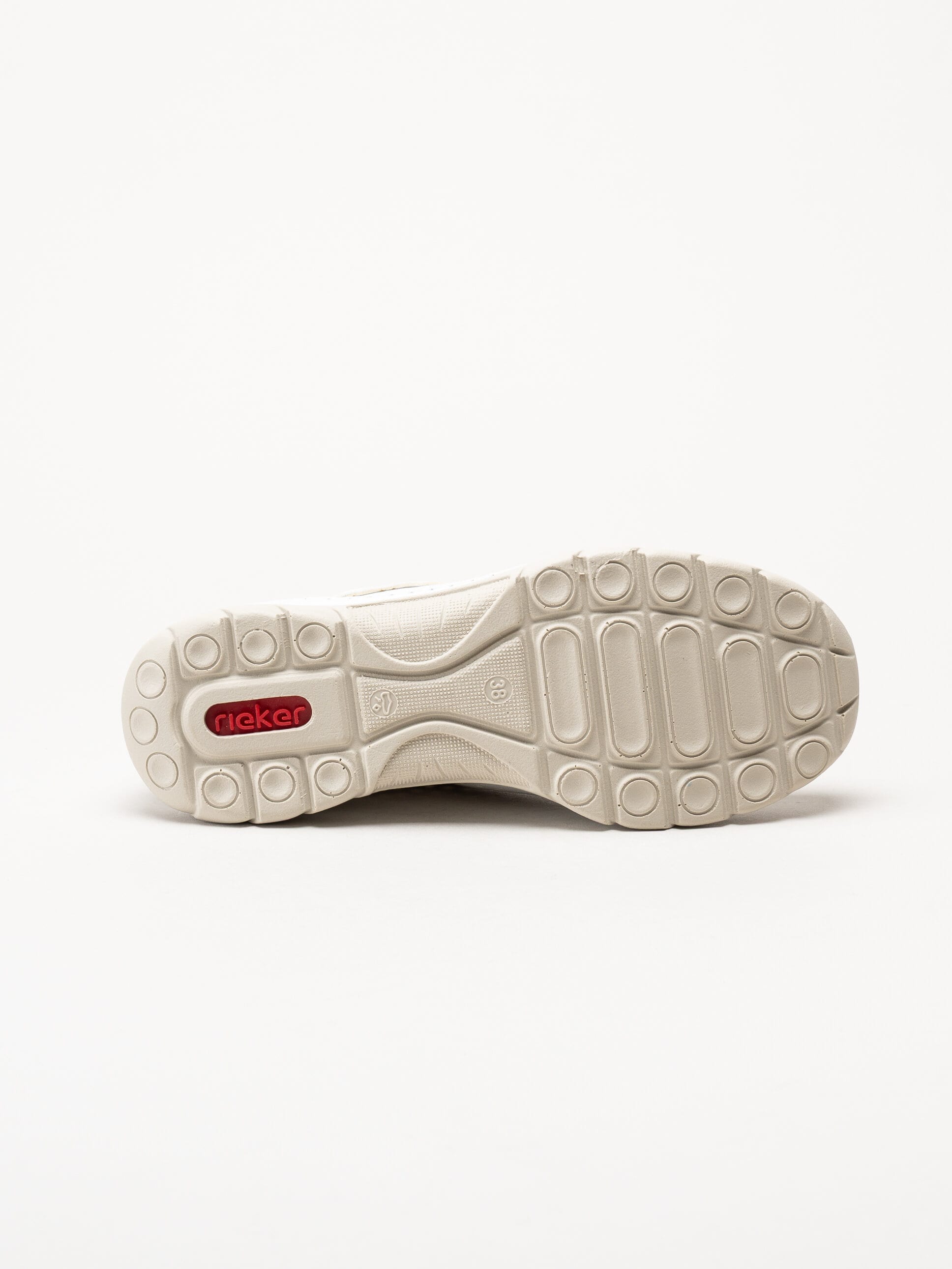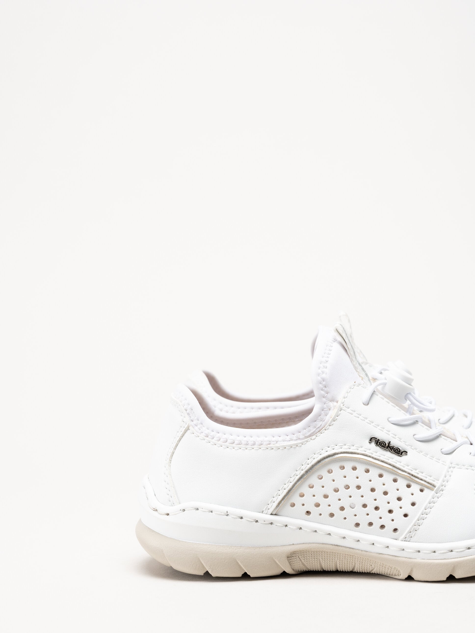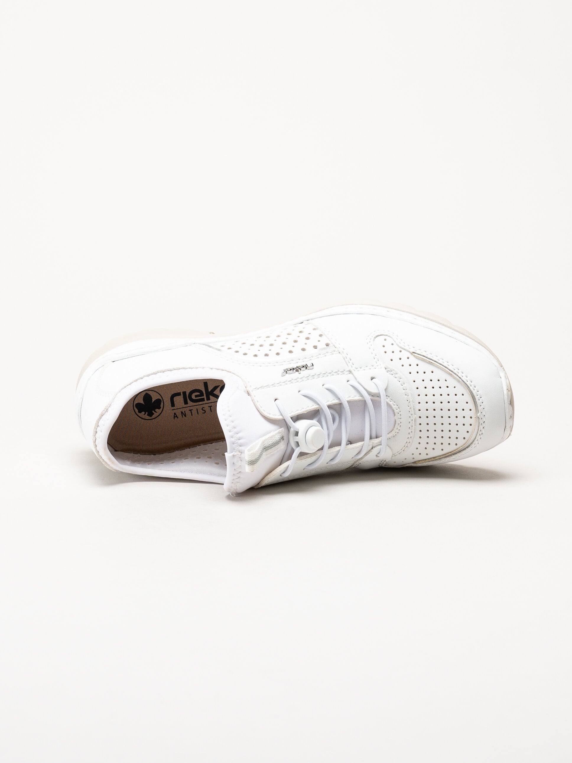 Vita slip-on skor i skinnimitation från Rieker. Skorna är tillverkade i en kombination av syntet och textil som ger en lätt och flexibel känsla samt ett stilrent uttryck. Den praktiska slip-on-designen tillsammans med snabbsnörning gör dem enkla att ta på och av samtidigt som passformen enkelt kan justeras.