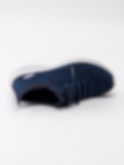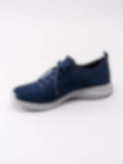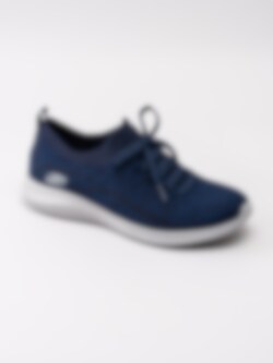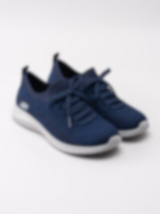 Sportsko Ultra Flex Statements från Skechers. Utmärkt dra-på modell tillverkad i meshtyg som känns skön mot foten. Sömlös logga på utsidan. Utrustad med Memory Foam innersula för ökad komfort. Mörkblå snörning i polyester med 4 hål för att justera passform. Hälla på bakskaft som hjälpmedel vid påtagning. Mörkblått foder och innersula i textil med sömlös logga. Grå yttersula i syntet med randigt mönster och logga.