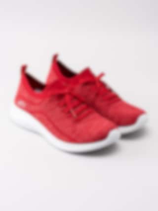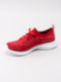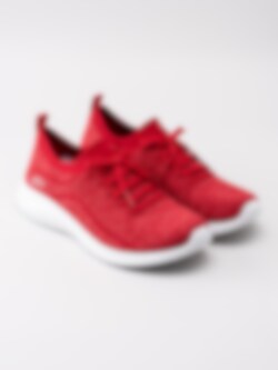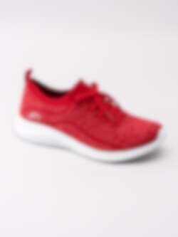 Sportsko Ultra Flex Statements från Skechers. Utmärkt dra-på modell tillverkad i meshtyg som känns skön mot foten. Sömlös logga på utsidan. Utrustad med Memory Foam innersula för ökad komfort. Röd snörning i polyester med 4 hål för att justera passform. Hälla på bakskaft som hjälpmedel vid påtagning. Rött foder och innersula i textil med sömlös logga. Vit yttersula i syntet med randigt mönster och logga.