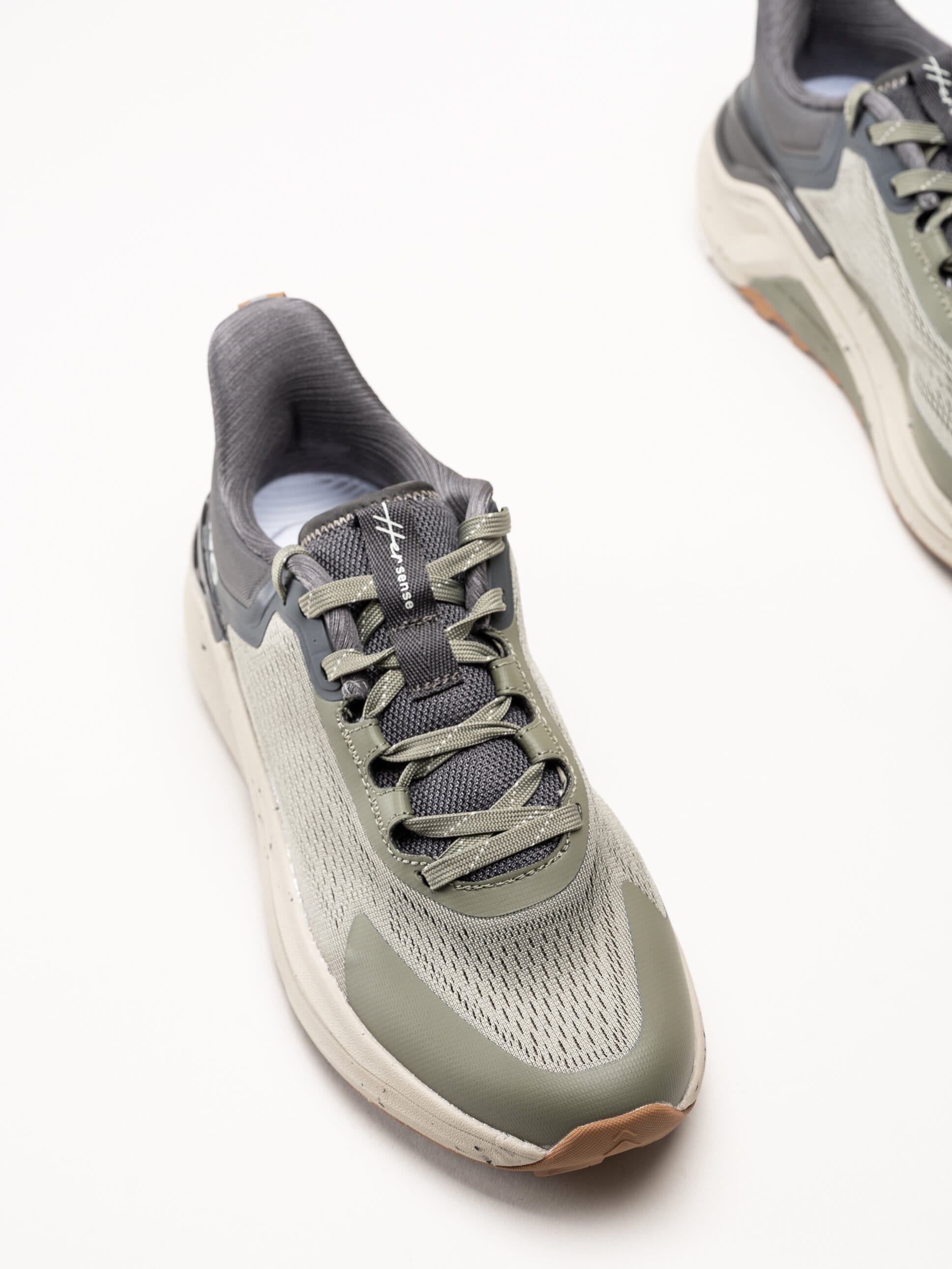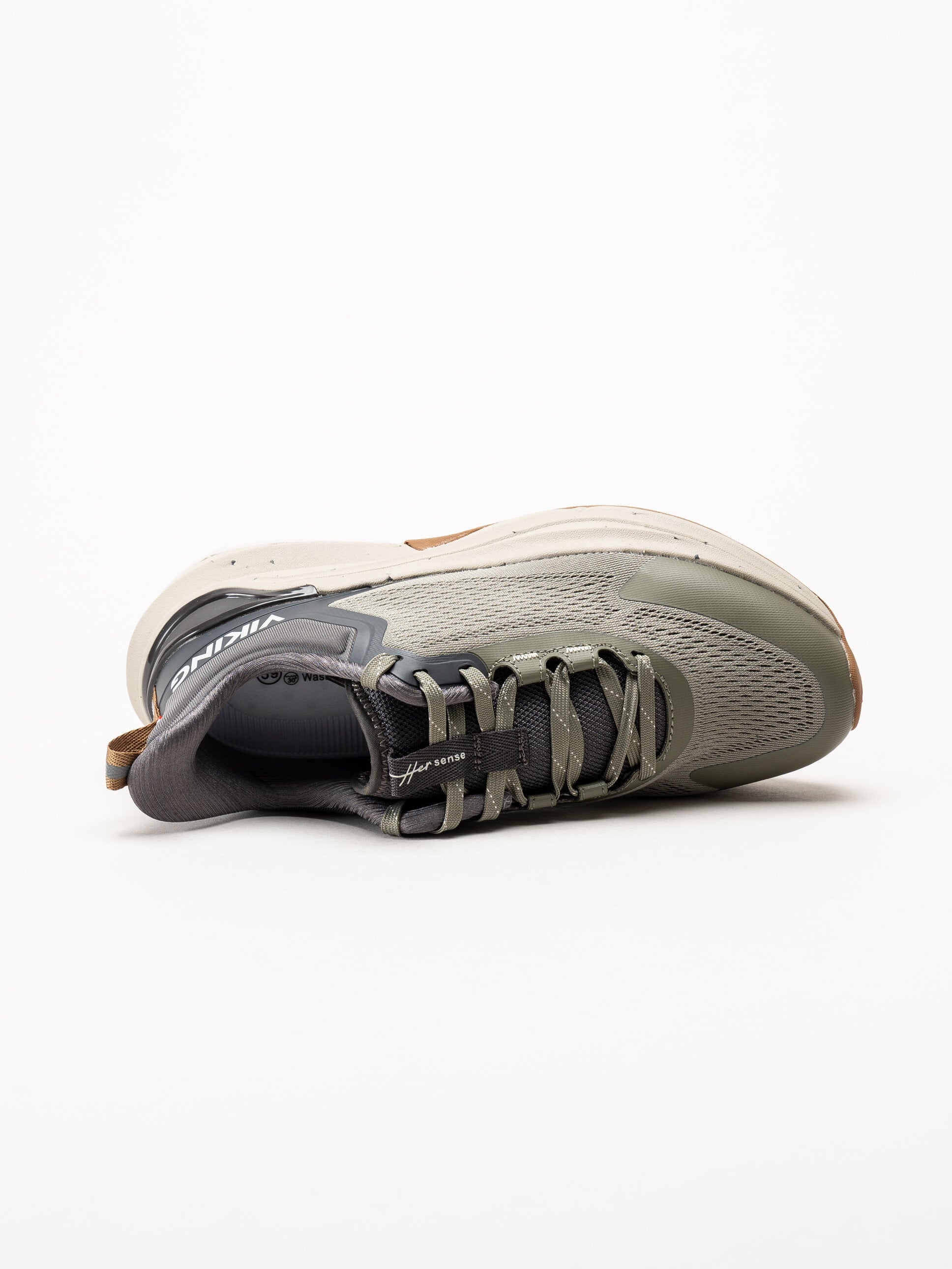 Gröna sneakers i mesh Her Sense från Viking i färgen Olive. Skorna är tillverkade i lätt och ventilerande mesh kombinerat med syntet. Invändigt är modellen fodrad med textil, och den löstagbara innersulan i textil ger mjuk komfort samt möjlighet att anpassa passformen eller använda egna iläggssulor.