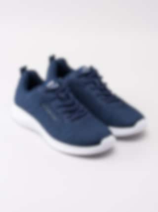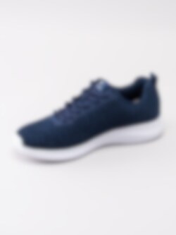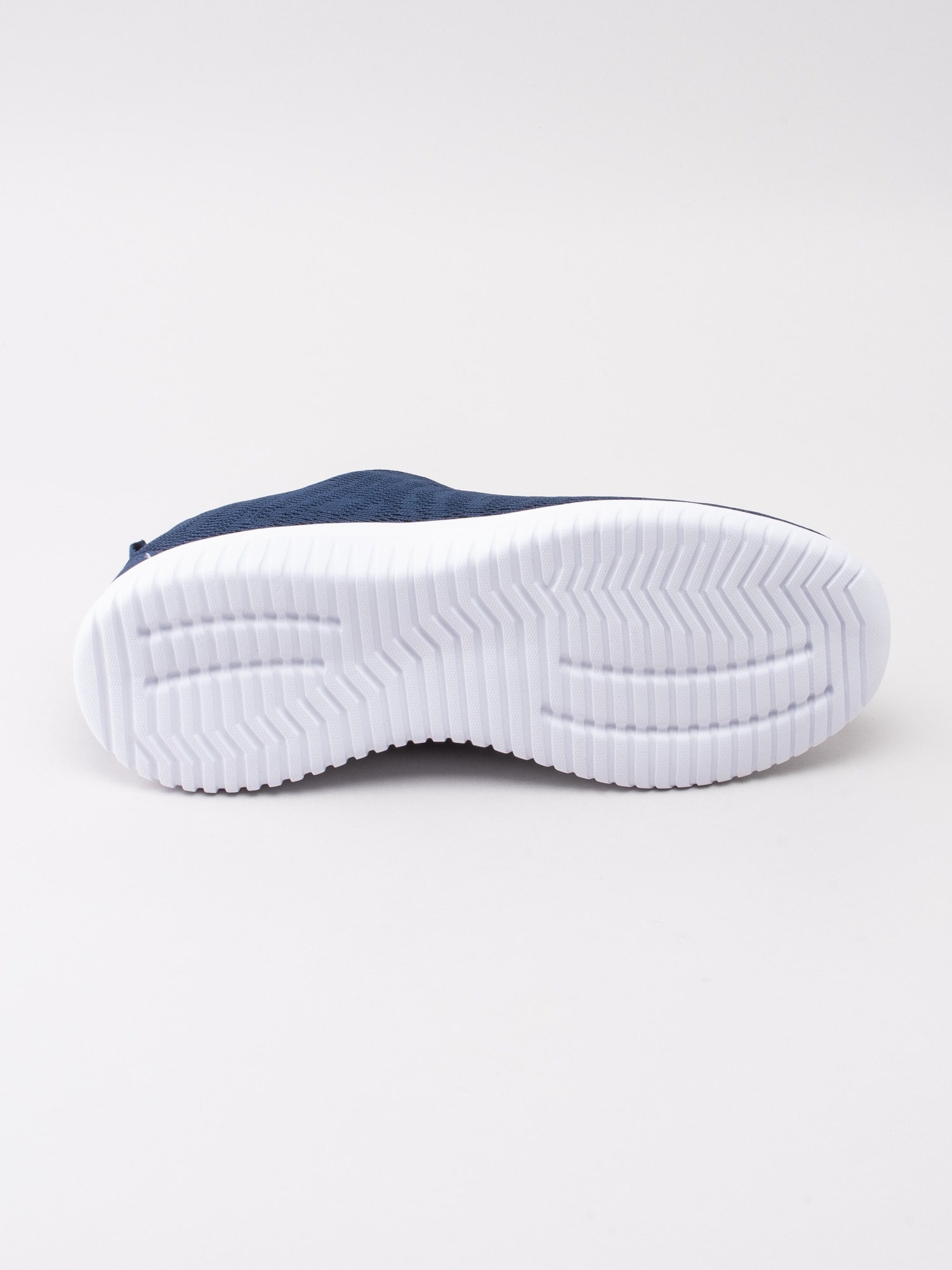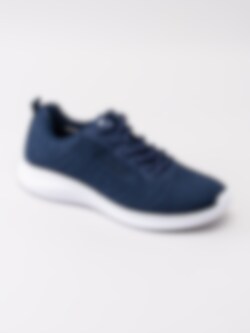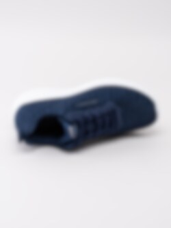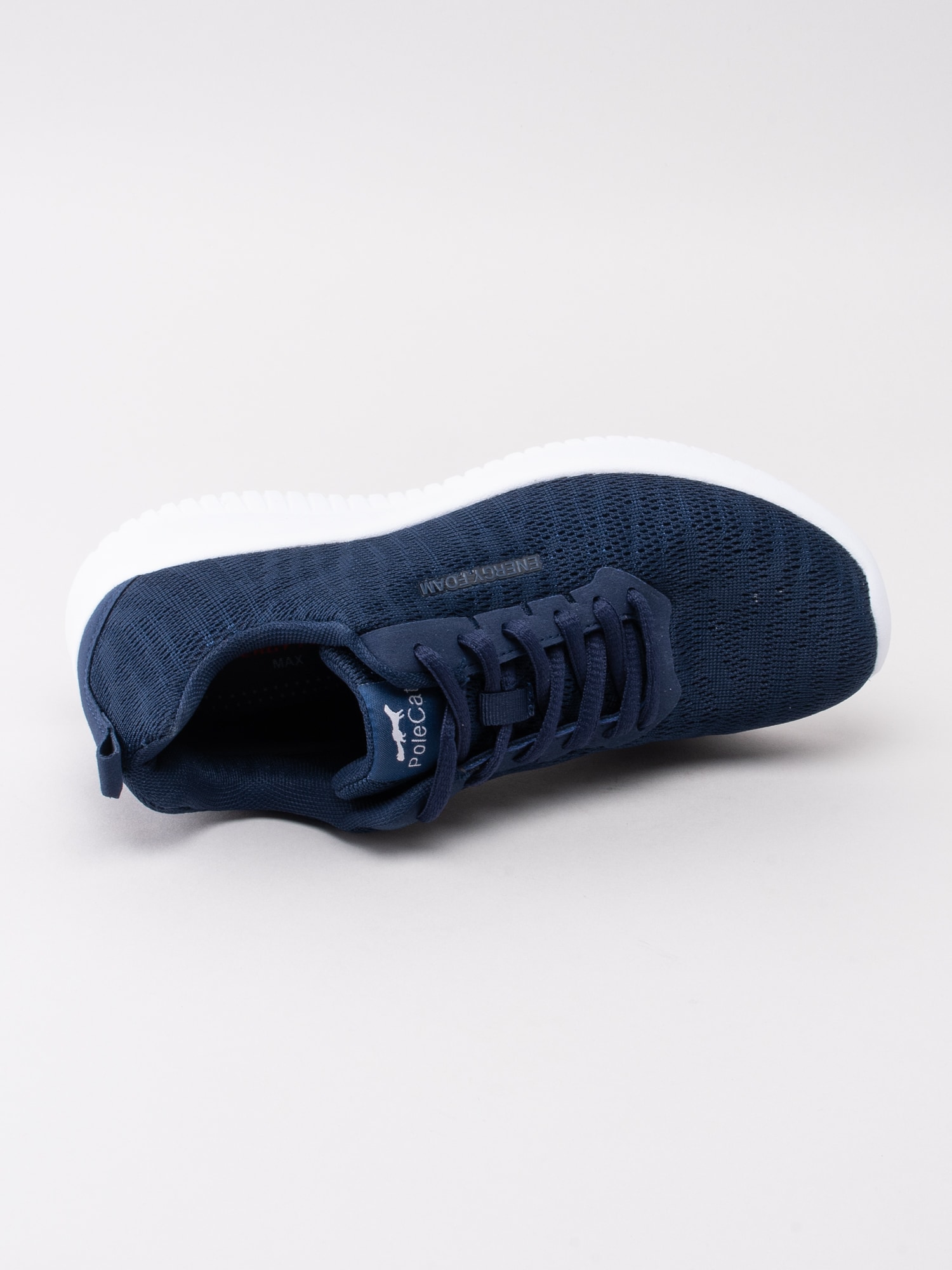 Mörkblå sportskor från PoleCat tillverkad i meshtyg. Utrustad med Energy Foam Max innersula som formar sig efter foten. Logga på plös och på utsidan. Mörkblå snörning i polyester på 6 hål med som öppning. Hälla på bakskaft som hjälpmedel vid påtagning. Mörkblått foder och innersula i textil med sömlös logga. Vit yttersula i syntet med randigt mönster.