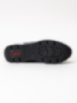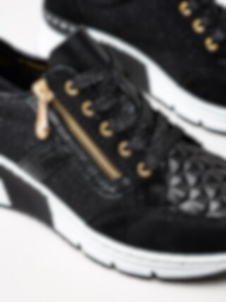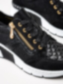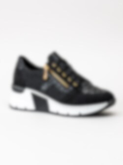 Svarta kilklackade sneakers i nubuck med partier i textil och syntet från Rieker. Snygga promenadskor med guldfärgad dragkedja på sidan. Foder i syntet och uttagbar innersula i skinn. Yttersula i syntet med en klack på ca 5 cm. Utrustad med Rieker Antistress för att avlasta foten från påfrestning. En snygg och skön sko!