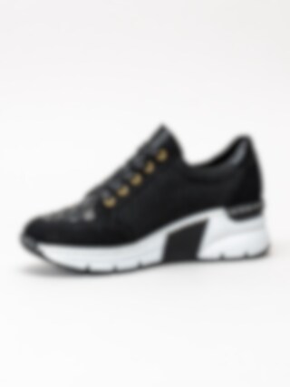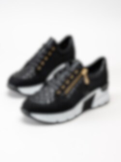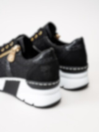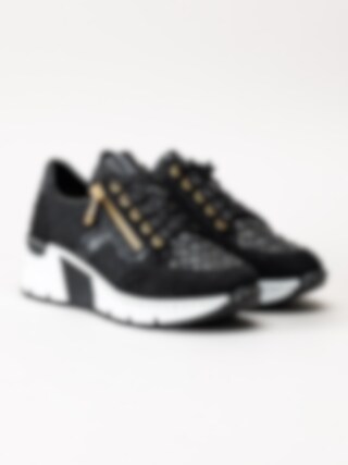 Rieker - Svarta kilklackade sneakers i nubuck med gulddetaljer