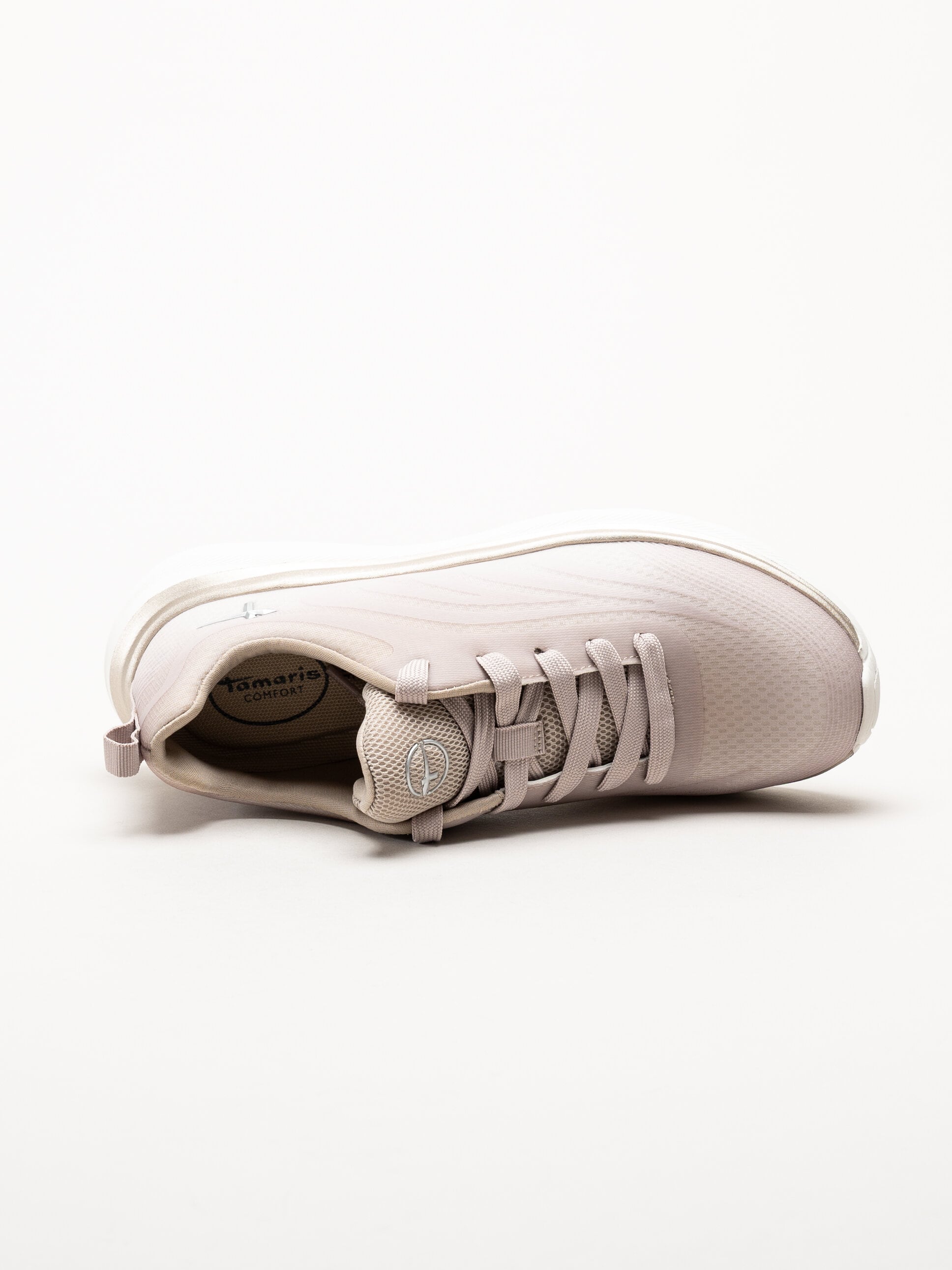 Beige sneakers i mesh Wide fit från Tamaris. Skorna är tillverkade i lätt och ventilerande mesh kombinerat med syntetmaterial, vilket ger en fräsch, sportig look och ett behagligt luftflöde under hela dagen.