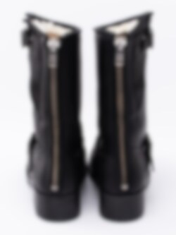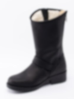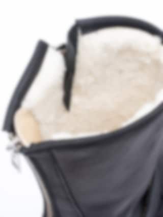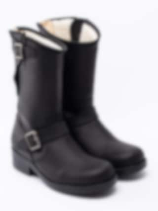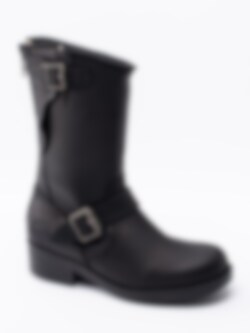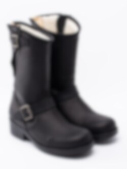 Fodrad, mellanhög bikerstövel från Johnny Bulls i oljad nubuck. Dragkedja i silver längs bakparti som öppning. Dekorativa remmar med spänne i silver vid skaft och runt vrist. Ljust foder och innersula i ull för att hålla dig varm. Klack på ca 4.5 cm. Svart yttersula i gummi med grovt mönster och logga.