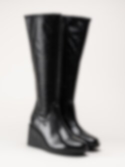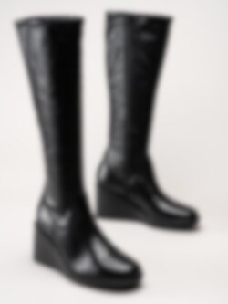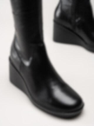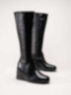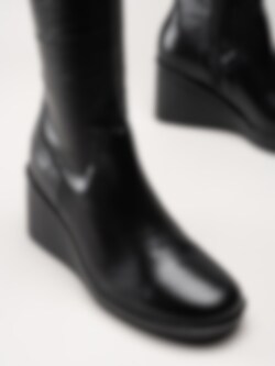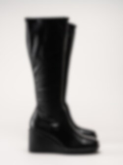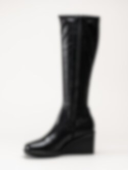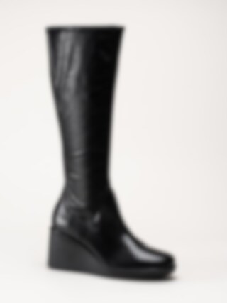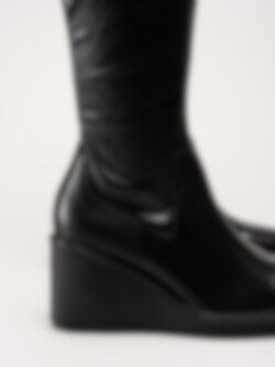 Svarta höga stövlar med hög kilklack. Modell Deena från Vagabaond är en serie med en lite mer rundad tåform. Skinn vid foten och ett skaft i strechigt syntetmaterial. Tunt fodrade och passar bra som en finstövel. Sulan av syntetiskt gummi är ganska lätt, flexibel och komfortabelt.