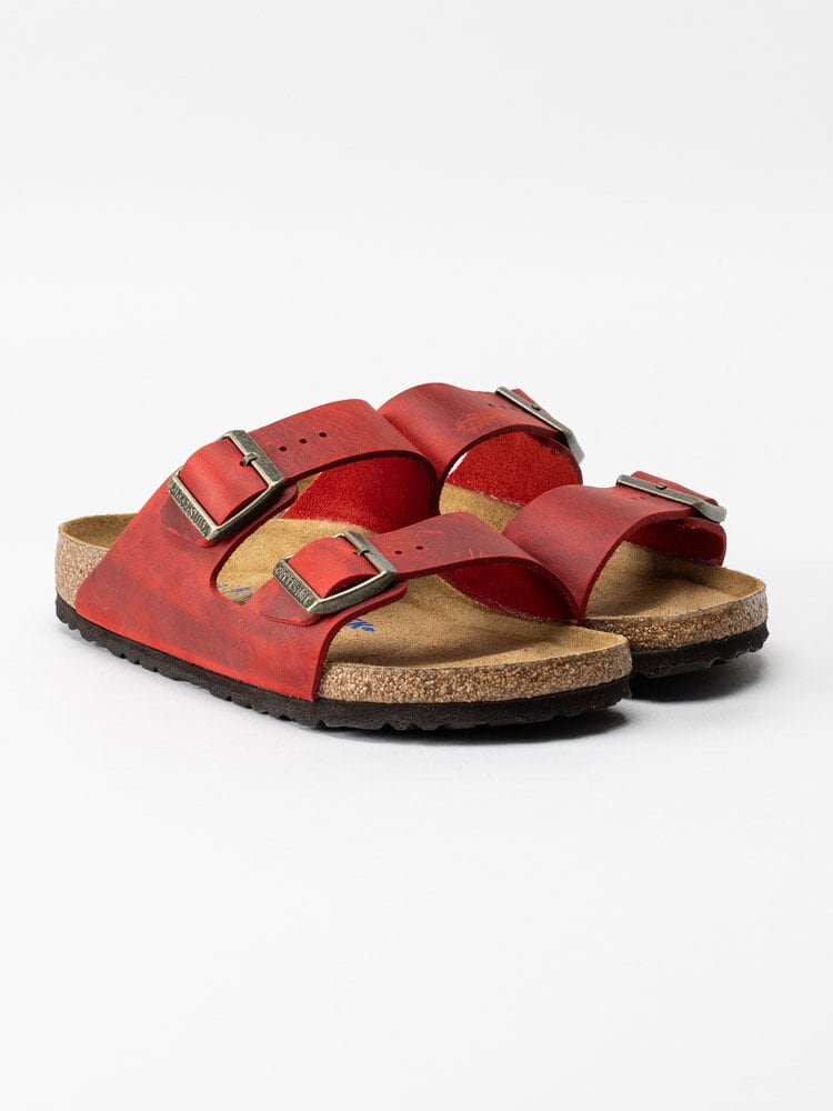 Röda slip in sandaler Arizona SFB från Birkenstock tillverkade i skinn. Mjuk fotbädd och bra passform. Två justerbara remmar med spännen i mässingsfärgad metall för att anpassa passform. Innersula i mocka med präglad logga. Mellansula i kork med upphöjd kant. Ljusbrun yttersula i syntet med mönster och logga.