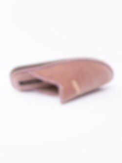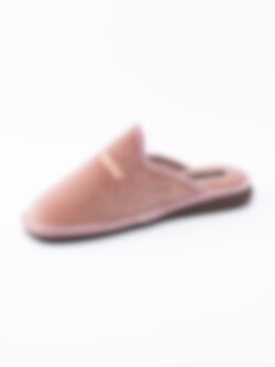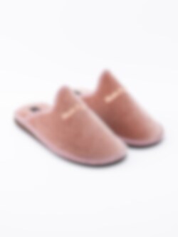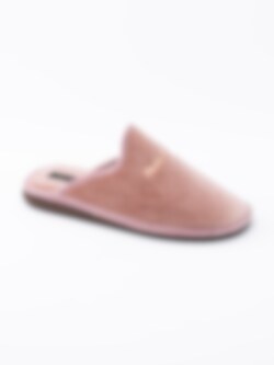 Rosa toffel från Hush Puppies i sammet med glitter på ovandel och sula. Broderad logga på ovandel. Rosa foder och innersula i textil med sydd logga. Brun yttersula i syntet med slät yta och präglad logga.