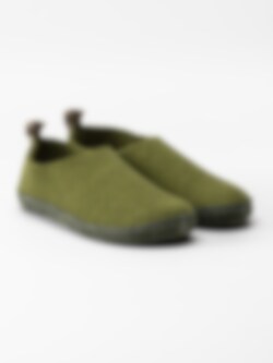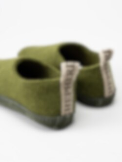 Gröna slip in ulltofflor Selma från Shepherd. Ett par varma och sköna damtofflor i ull. Hälla bak i naturfärgad juteväv med texttryck. Innersula i mjuk ull. Yttersula i borstad mocka.