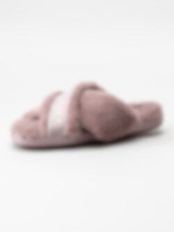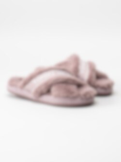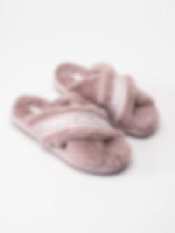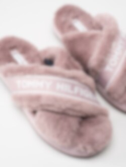 Rosa fluffiga slip in tofflor med korsade band från Tommy Hilfiger. Innetofflor i mjuk fuskpäls med vävt logoband på ovansidan. Bekväm slip in-modell med skönt sviktande sula.