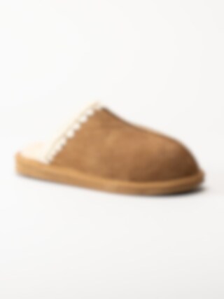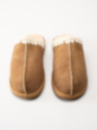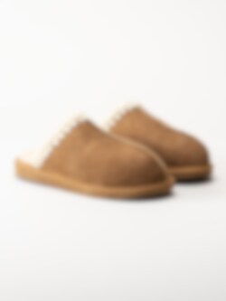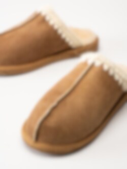 Ljusbruna fårskinnsfodrade tofflor från Shepherd. Tillverkade i mocka med foder och innersula i fårskinn. Yttersula i syntet.