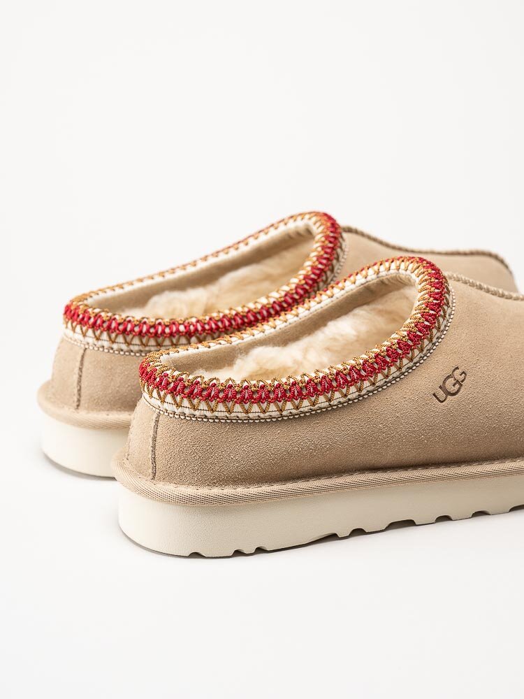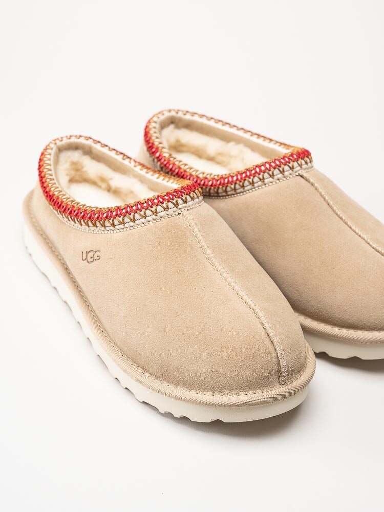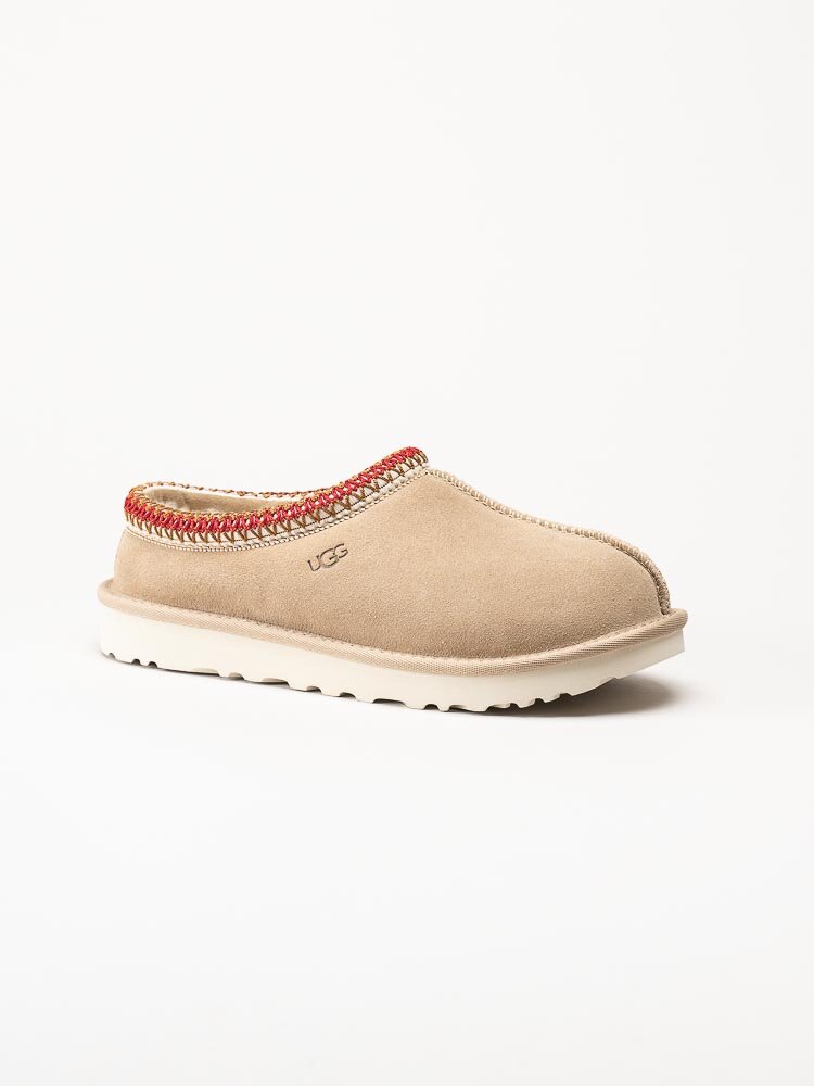 Beige tofflor TASMAN i färgen Sand Dark Cherry från UGG. Slip in modell med skönt foder i ullblandning som känns mysigt mot fötterna. Tillverkade i mocka och enkla att glida i och ta dig fram både hemma och utomhus. Fin läskad kant runt öppning som snygg detalj. Yttersula i syntet med en klackhöjd på cirka 3 cm.
