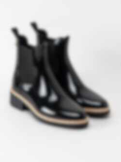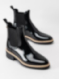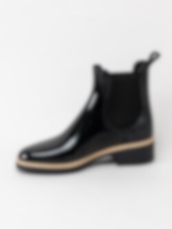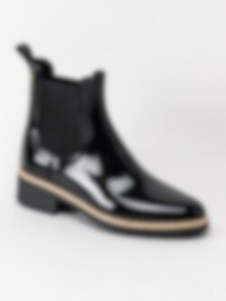Svarta låga gummistövlar Ava 01 från Lemon Jelly i syntet. Nytt varumärke hos oss med riktigt coola vattentåliga boots. Lackad kvinnlig siluett med kontrastfärg i nederkant ger attityd till denna modell. Perfekta boots till den svenska slaskiga perioden. Resår på in- och utsidan och hällor på skaftkant. Praktiska boots med snygg design minst sagt.