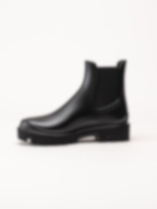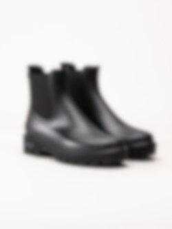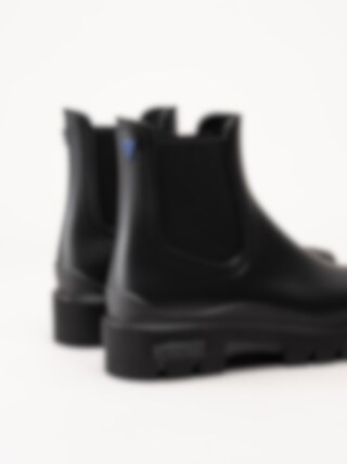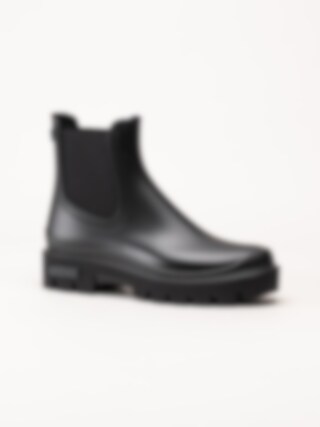 Svarta låga gummistövlar Mae Mate från Verbenas. Snygga gummistövlar med logga på klacken och chunky sula. De svarta elastiska banden ger dem en elegant Chelsea boots-stil. En trevlig gummistövel både till landet, skogen eller till city.