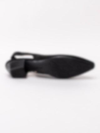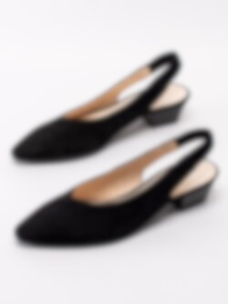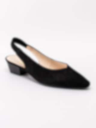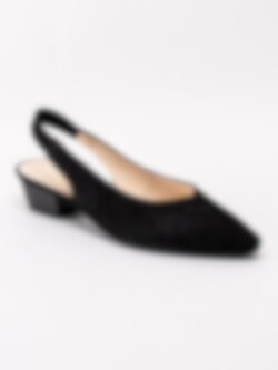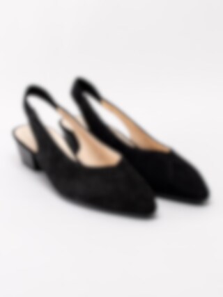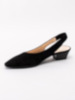 Svarta pumps från Gabor i mocka med slingback. Dressade pumps i en klassisk sommarmodell som du enkelt trär på tack vare sin elastiska hälrem. Skinnfodrade och innersula i skinn med präglad guldfärgad logotyp i hälen. Svart klossklack i träimitation på ca 4 cm. Svart yttersula i syntet med slingrande mönster och logotyp.