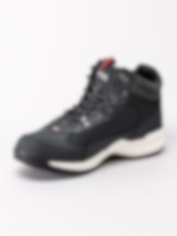 Svarta kängor Alpha Mid från Fila. Med en ovandel i skinn, ventilerad mesh och vadderad krage och plös är den riktigt skön. Du justerar passformen lätt med 7 håls snörningen. Broderad logo på utsidan, hälen och plösen. Urtagbar innersula i textil med tryckt logga. Mellansula med bra dämpning och komfort och en slitstark yttersula i gummi. Designen är både stilren och snygg och passar till alla olika kläder nu under hösten.