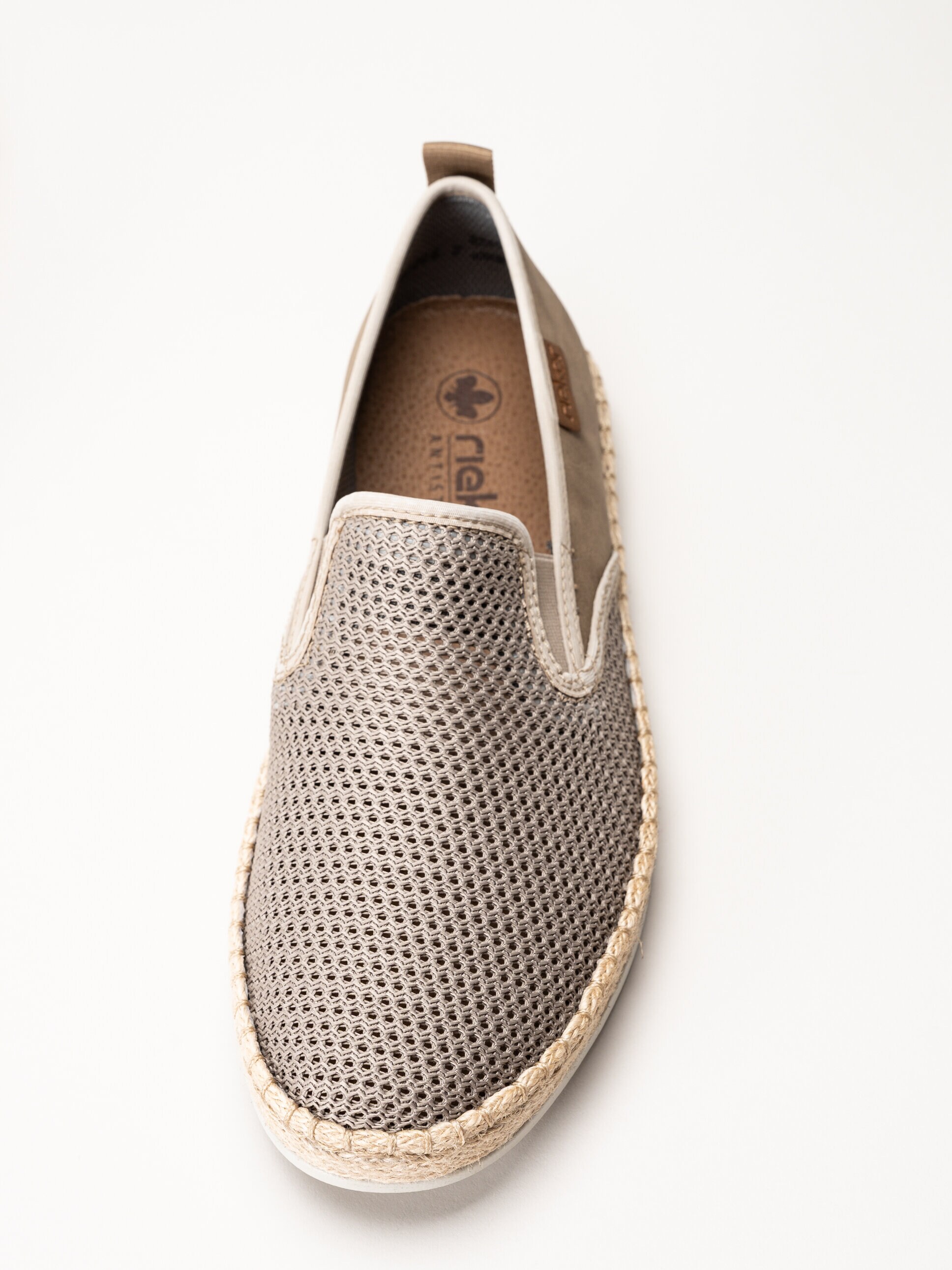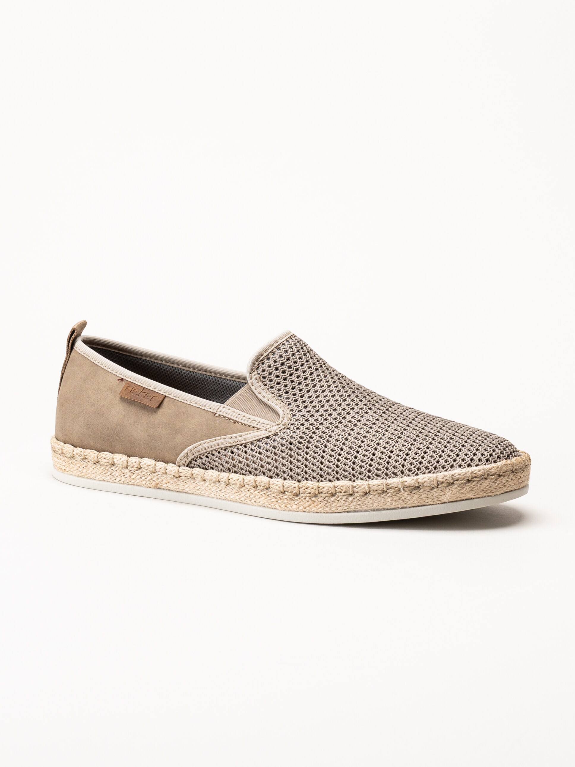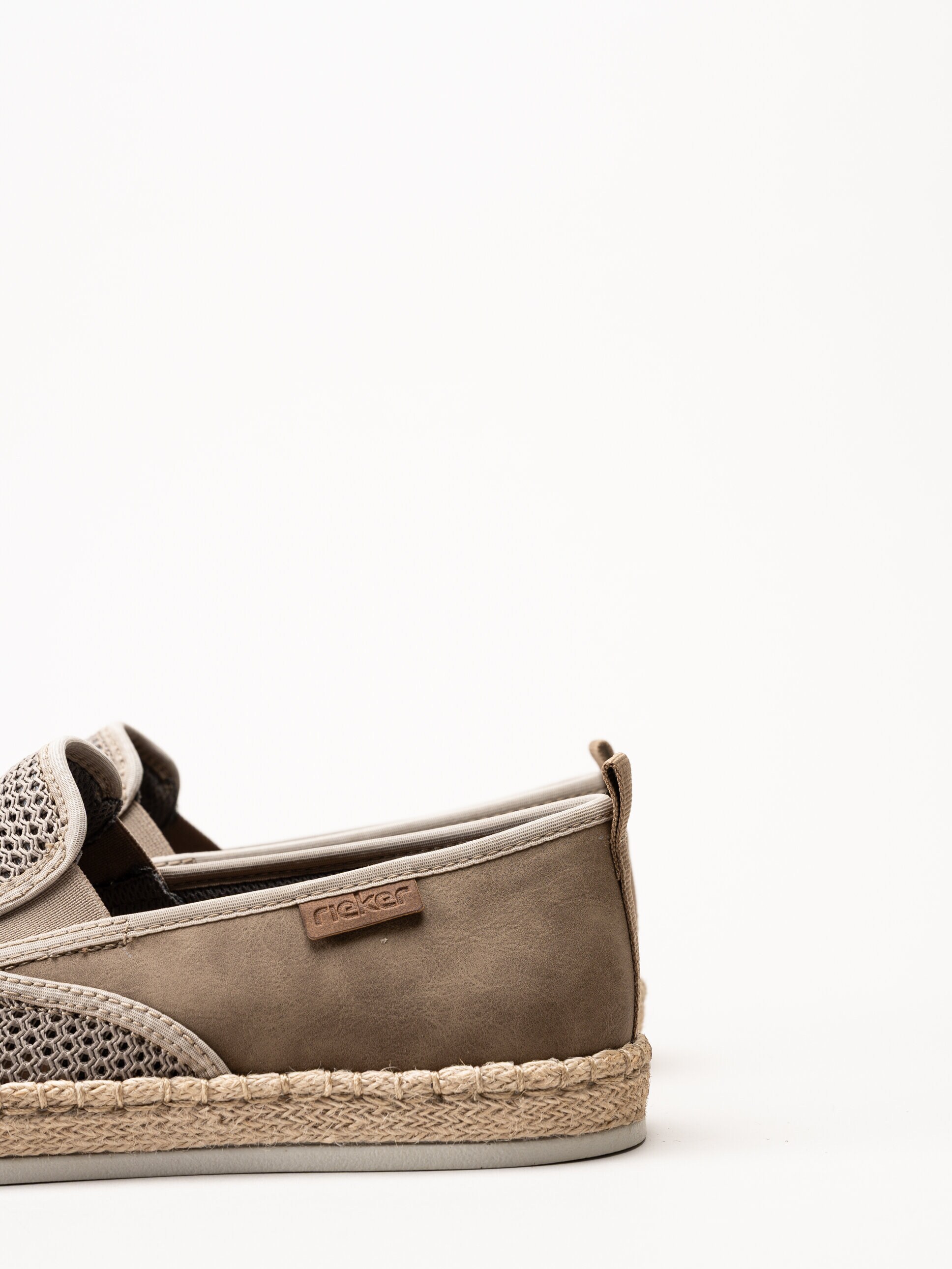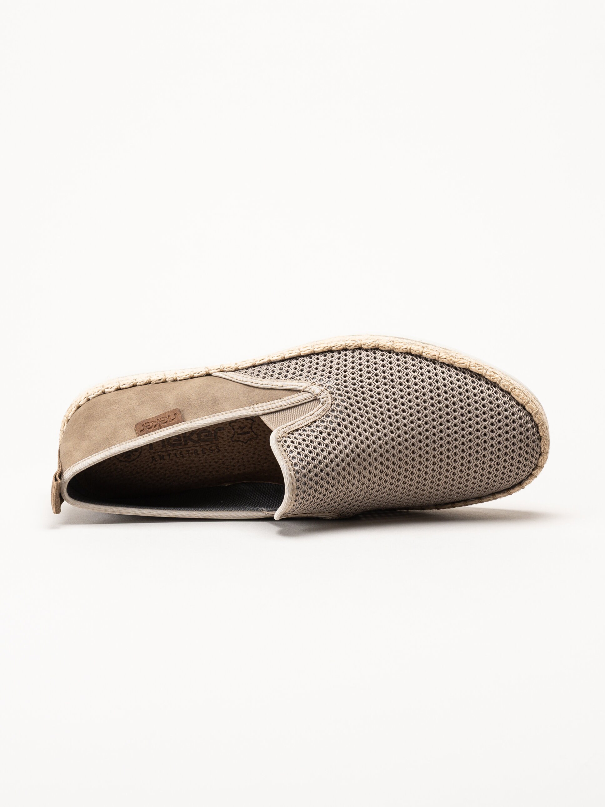 Beige lågsko från Rieker i färgen Stone med en avslappnad och bekväm design i espadrillosstil. Ovandelen är tillverkad i en kombination av textil och syntet som ger en lätt och följsam känsla.