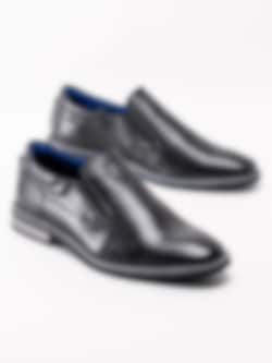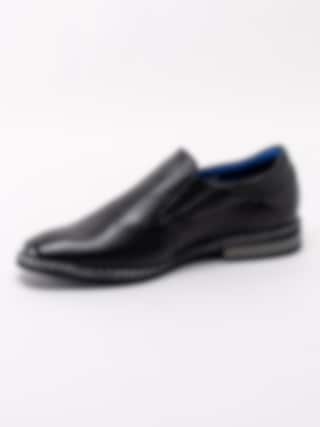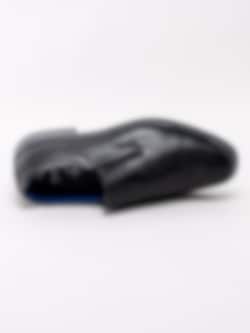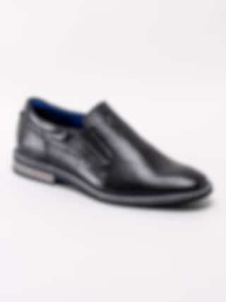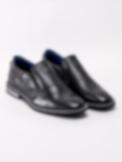 Svarta loafers Rafo ExKo från Bugatti i skinn. Fina skinnskor med subtil perforering som detalj. Konturerad logotyp på plös. Resår vid öppning för smidig påtagning. Textilfodrade med löstagbar innersula i skinn. Ljus söm längs sulkant. Flerfärgad klack på ca 2.5 cm. Mörkblå yttersula i syntet med präglad logotyp.
