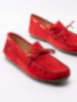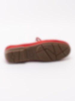 Röda loafers från Luis Stockholm tillverkade i mocka med sydd rand längs framparti. Dekorativt läderband runt öppning samt rosett på ovandel. Präglad flamingo på utsidan. Beigt foder och innersula i skinn med sömlös logga i silver i hälen. Brun yttersula i syntet med konturerat mönster.