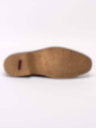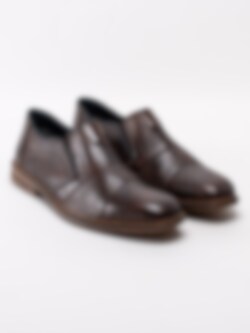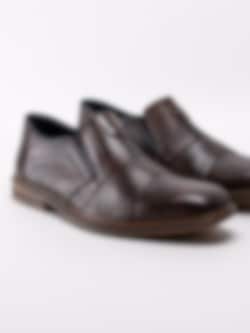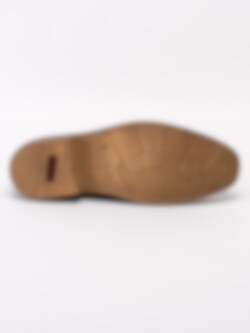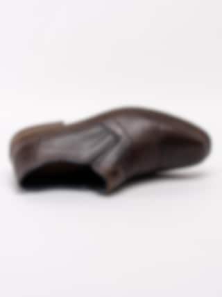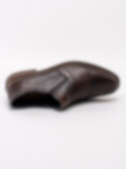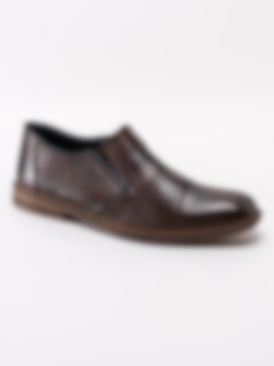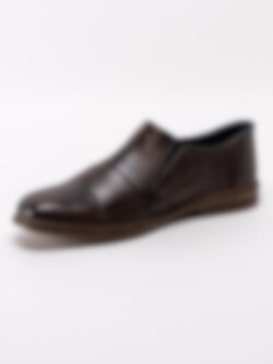 Mörkbruna loafers från Rieker tillverkade i skinn med blåa partier. Sömmar och perforering som detalj. Resår på in- och utsidan för lätt på- och avtagning. Foder i textil och innersula i skinn. Söm längs sulkanten som detalj. Låg klack på ca 2.5 cm. Brun yttersula i syntet med röd logga.