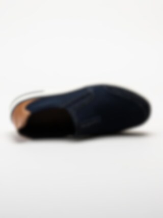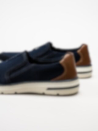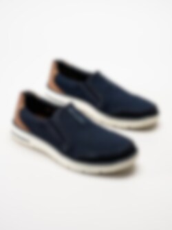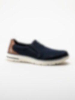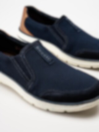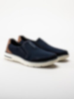 Slip on skor Bax Comfort Dark Blue i nubuck från Rieker. Perfekta skor till mildare väder. Bugatti logga på plösen och brunt skinnparti bak. Foder och uttagbar innersula i textil. Vit yttersula i syntet. En fin modell att spendera våren och sommaren i!
