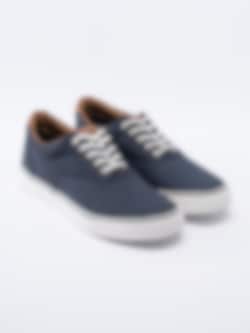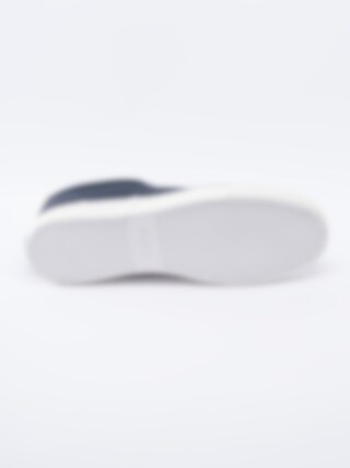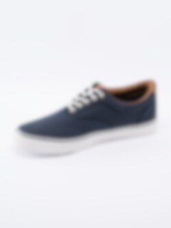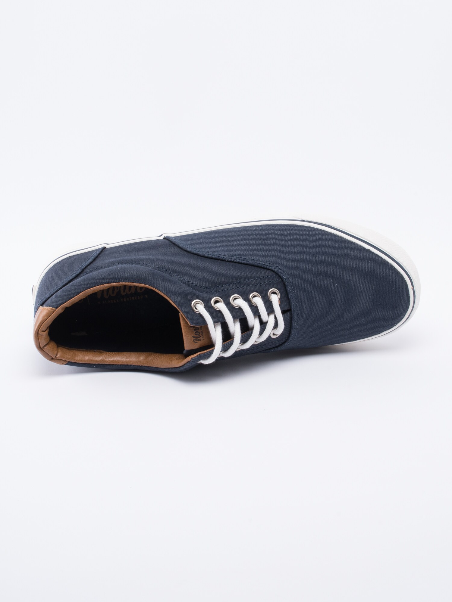 Lågsko Nilan från North är mörkblå tygsko med vit snörning. Bruna partier i syntet. Präglad logga på plös. Vit, tät snörning i bomull på 5 hål med öljetter i silver som öppning. Foder i textil och innersula i textil med sömlös logga. Mörkblå rand längs sulkant. Vit yttersula i gummi med mönster och logga.
