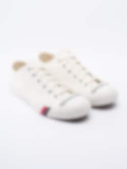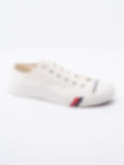 Sneaker Royal Lo från PRO-Keds är en vit snörsko i textil. Vit gummitå. Vit snörning i bomull med 6 hål som öppning med öljetter i silver. Vita sömmar som detalj. Beiget foder och innersula i textil med logga. Röd och mörkblå rand som detalj på vita mellansulan. Brun yttersula i gummi med mönster och logga.