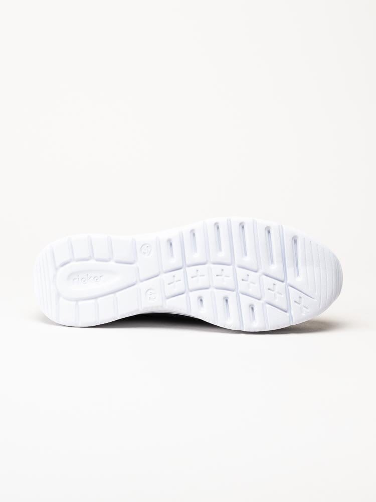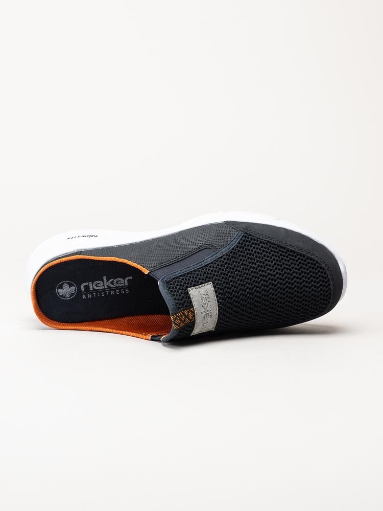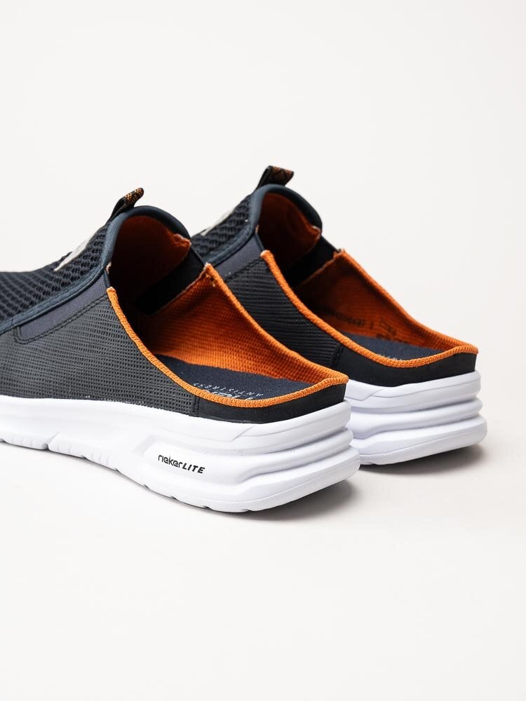 Mörkblå slip-in sandaler från Rieker i färgen Blue. Skorna är tillverkade i en lätt och bekväm kombination av syntet och textil som ger ett sportigt och modernt uttryck, perfekt för varma dagar och avslappnade tillfällen.