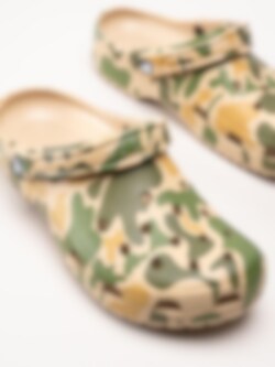 Camouflagefärgade tofflor Classic Clog från Crocs tillverkade i mjukt Croslite material för ökad komfort och stötdämpning. Lufthål på ovandel och vid främre partiet. Rem som går att fälla upp och ned. Rund svart plastbit med vit logga som håller remmen på plats. Yttersula i Croslite med randigt mönster.