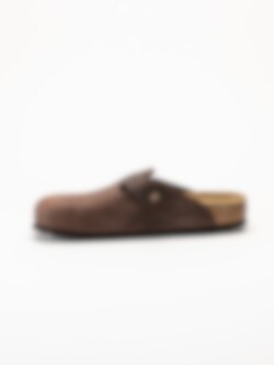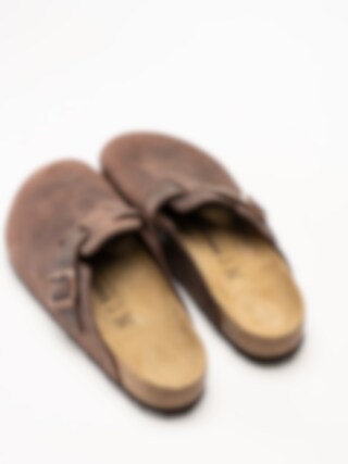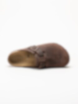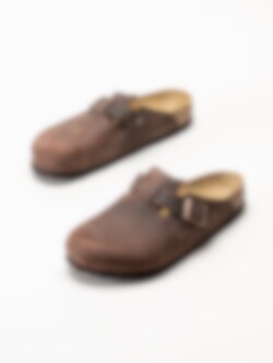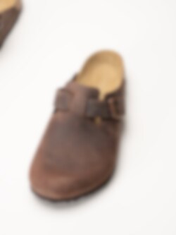 Mörkbruna slip-in sandaler Boston från Birkenstock i färgen Habana. Skorna är tillverkade i oljad nubuck som ger ett mjukt och följsamt uttryck samt utvecklar en vacker patina med tiden. Modellen har ett dekorativt spänne med rem som är delvis justerbar, och Regular fit gör sandalerna perfekta för normal till bred fot. Den klassiska Birkenstock-fotbädden i mocka tillsammans med mellansula i kork och juteväv ger ergonomiskt stöd och en behaglig känsla vid varje steg.