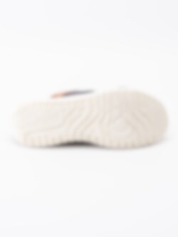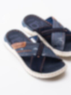 Mörkblå slip ins sandaler Idaho från Bugatti med korslagda band tillverkade i mocka och jeanstyg. Sömlös logga längs övre bandet. Präglad logga på brun läderbit på utsidan. Mörkblått foder och innersula i textil med sömlös logga i hälen. Brun söm mellansulan. Ljus yttersula i syntet med randigt mönster och konturerad logga.