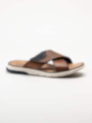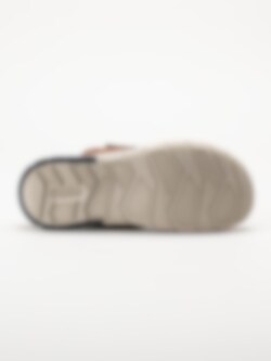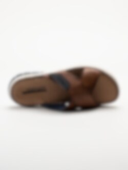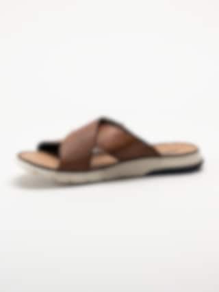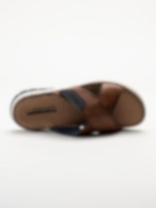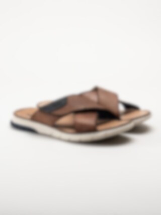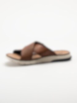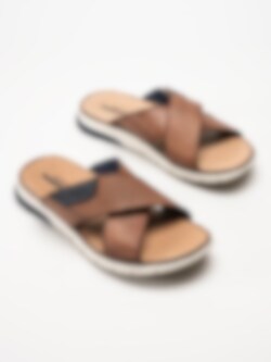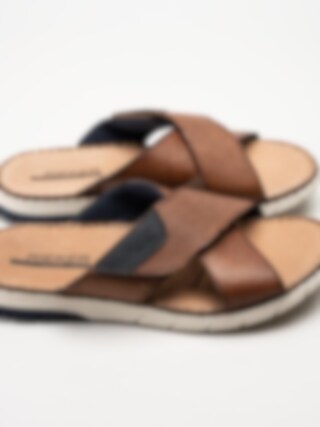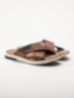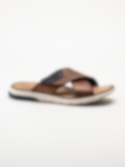 Bruna slip in sandaler i skinn från Rieker. Korsade breda band över fot. Sandalerna har extra bredd för rymligare passform. Foder i textil och innersula i skinn med Riekers Antistress teknologi som håller hela dagen. Ljus yttersula i syntet med mönster och logga. En härlig modell att spendera sommaren i!