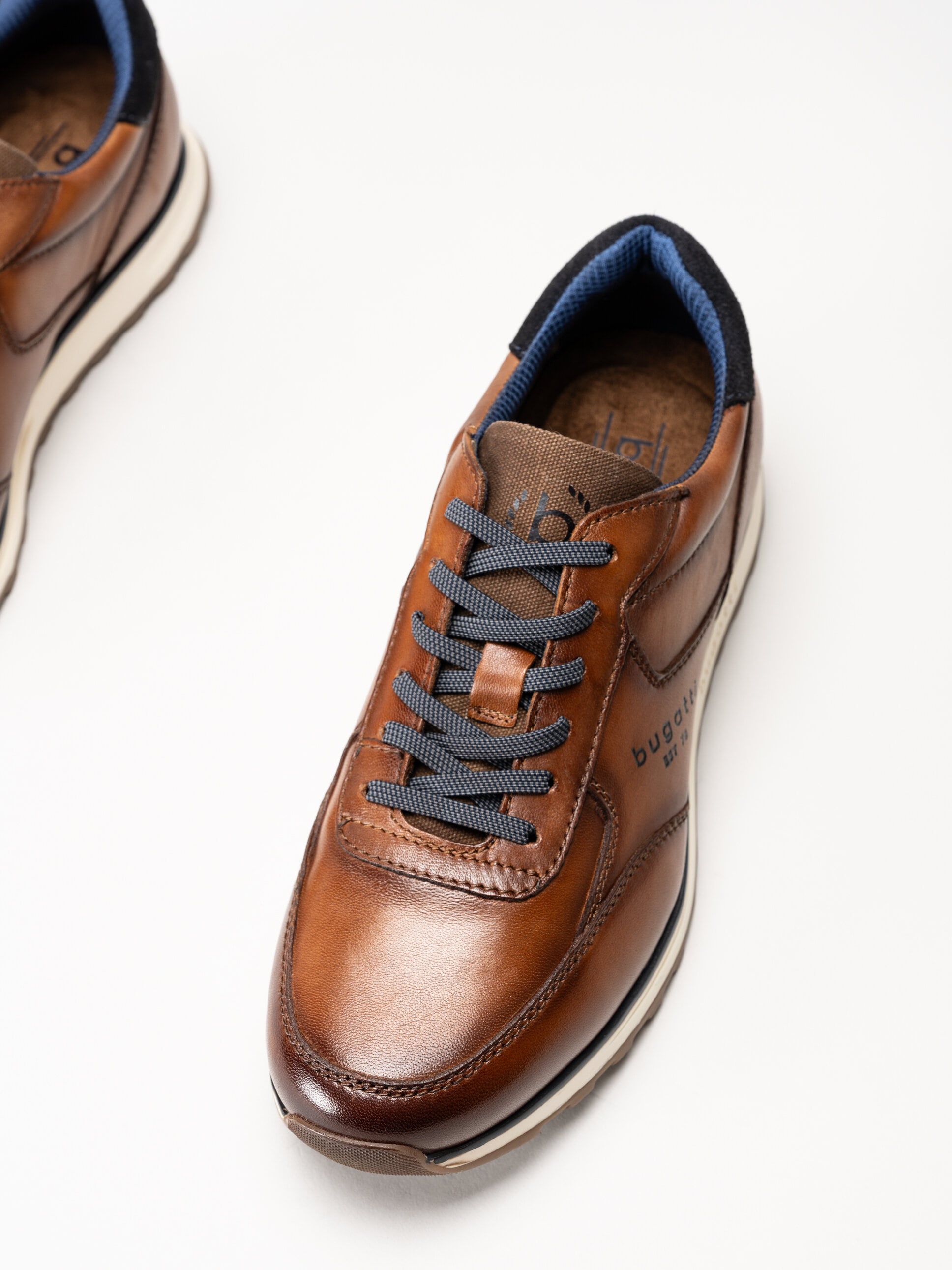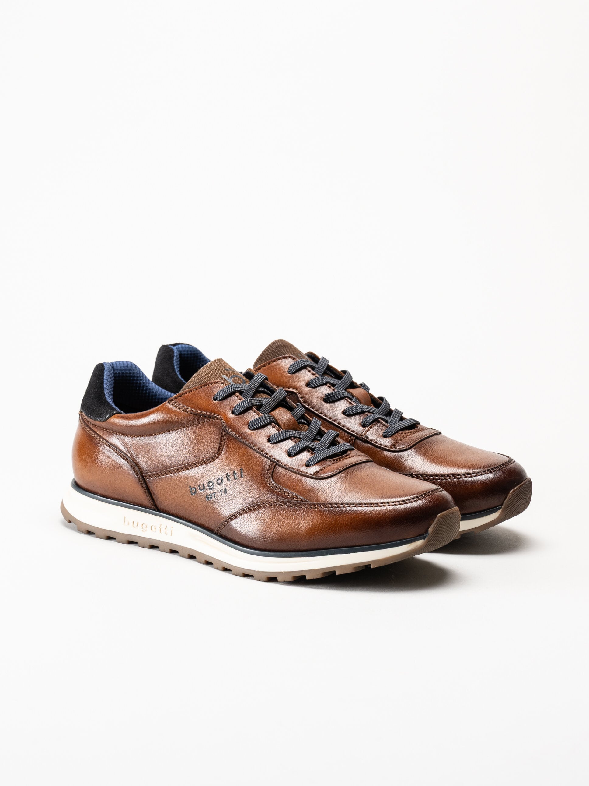 Bruna dressade sneakers i skinn från Bugatti, modell Cirino, i färgen Cognac. Skorna är tillverkade i slätt skinn av hög kvalitet som ger ett elegant och modernt uttryck, perfekt för dig som vill kombinera ett mer uppklätt utseende med bekvämligheten hos en sneaker.