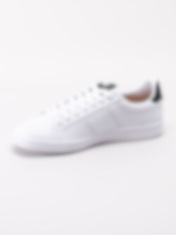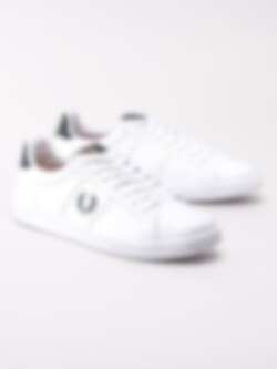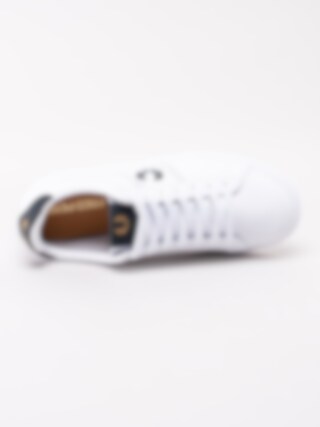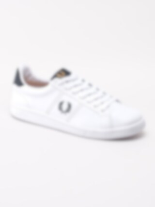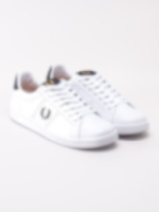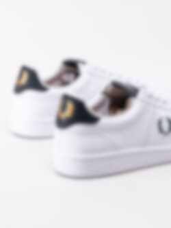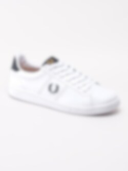 Vita tennis sneakers B721 från Fred Perry tillverkade i täckfärgat skinn. Designad med perforerade ränder på in- och utsidan som detalj. Broderad logga på utsidan och guldfärgad logga på plös och på bakparti. Konturerad logga på utsidan av sulan. Textilfodrade med brun innersula i syntet och textil. Vit yttersula i gummi med mönster. Klassisk sneakersmodell från Fred Perry som är ett självklart skoval i garderoben.