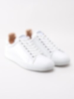 Vita sneakers Selim från Philip Hog i skinn. Klassiska vita sneakers som går att styla med de flesta outfits. Logotyp på tygbit på plös. Vit 7-håls snörning i bomull med bronsfärgade öljetter för att kunna anpassa till individuell passform. Skinn- och textilfodrade med löstagbar innersula i skinn med svart, sömlös logotyp. Vit sula i syntet med räffad yta.