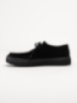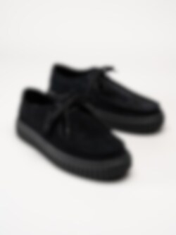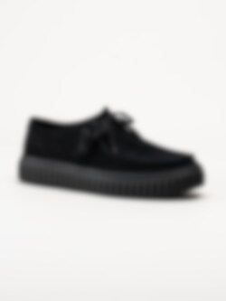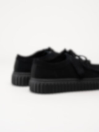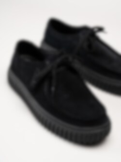Svarta snörskor i mocka, Torhill Lo G Black Sde från Clarks. Skorna kombinerar en avslappnad och sportig look med hög komfort och kvalitet. Den kraftiga, räfflade Gymmi-yttersulan ger både bra grepp och dämpning, samtidigt som den bidrar till en modern, robust siluett.