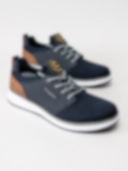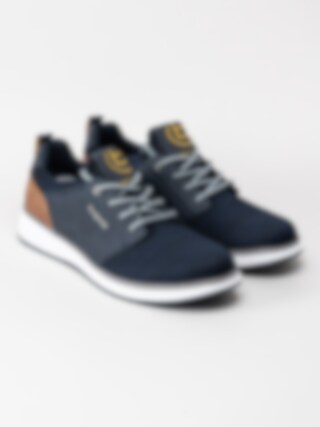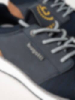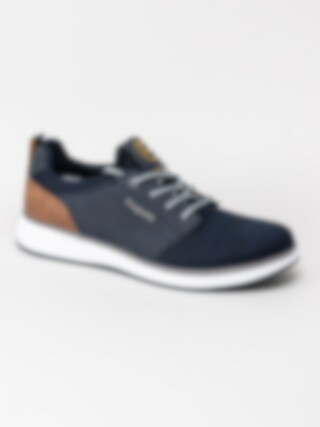 Marinblå casusal skor i textil från Bugatti. 4 håls dekorativ snörning med en elastisk slip on konstruktion. Eleganta vardagsskor med bruna partier som en snygg detalj. Bugatti logga på plösen och utsidan. Mörkblå yttersula i gummi med bra mönster för ett bättre grepp mot underlaget. Stötdämpande mellansula. En bekväm och trevlig sko som passar många under vår och sommar.