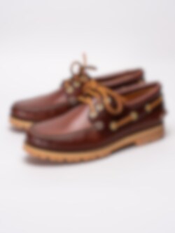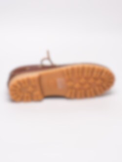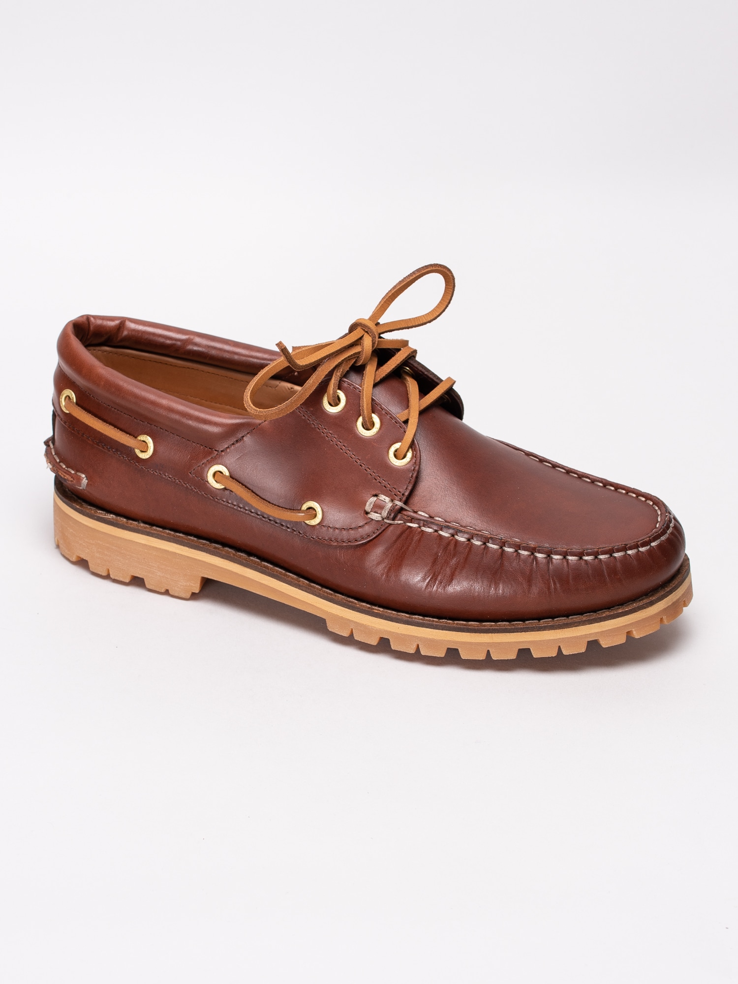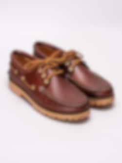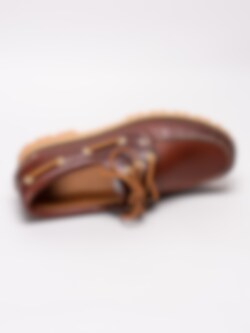 Bruna seglarskor Chris M från Vagabond tillverkade i skinn. Ljus sydd söm längs framparti och bruna läderband med öljetter i guld runtom som är klassiskt för en seglarsko. Brun snörning i läder på 3 hål med öljetter i guld som öppning. Brunt foder och innersula i skinn som sömlös logga. Brun läderrand med dekorativ söm längs sulkant. Beige Vibram-yttersula tillverkad i gummi för bästa möjliga grepp.