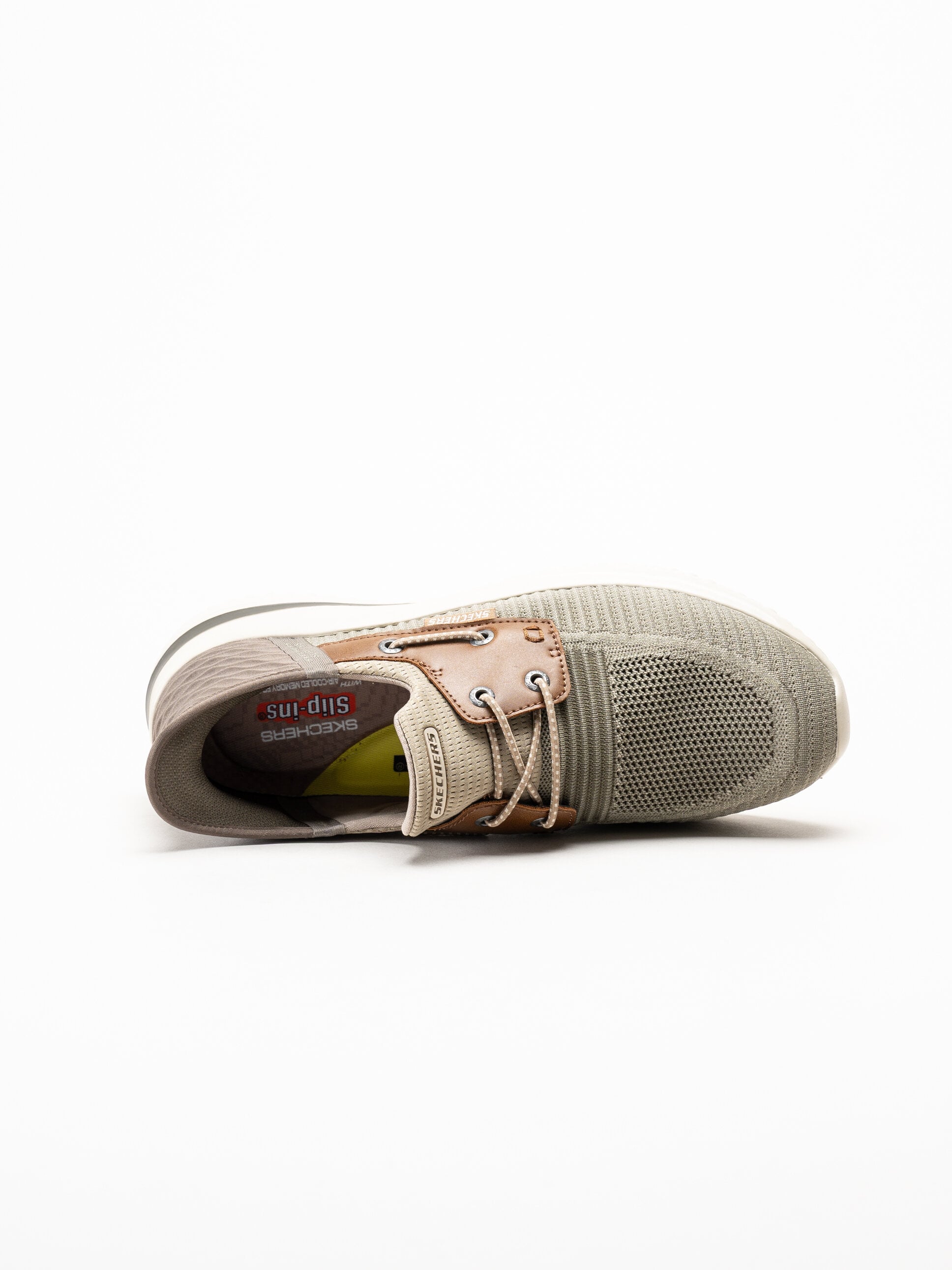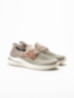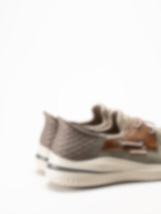Kakifärgade slip-ins sneakers från Skechers i färgen Taupe/Brown. Skorna är tillverkade i en kombination av mesh, textil och syntet som ger en lätt, ventilerande och sportig känsla med ett stilrent uttryck. Den praktiska Slip-ins-designen gör skorna enkla att ta på och av utan att behöva använda händerna.