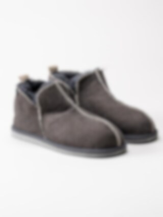 Grå slip on fårskinnstofflor Andy från Shepherd. Härlig och cool modell i grå fårskinn, med tuff detalj på baksidan. Gummisulan gör att du lätt kan ta dig ut med dem. Finns i både dam och herr.