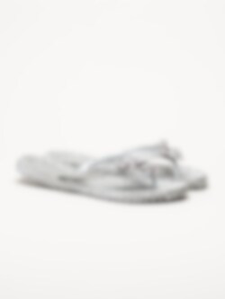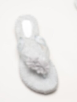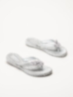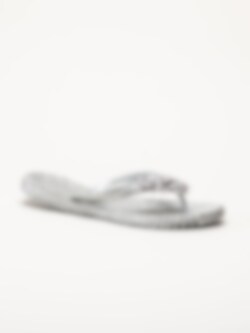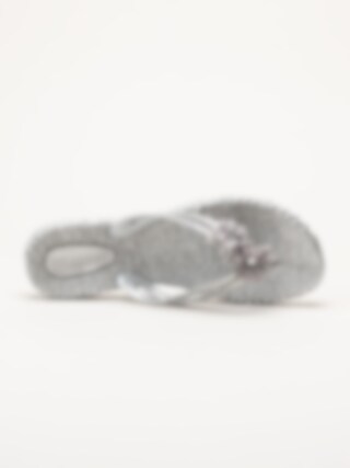 Silverfärgade flip flops Cheerful18F i färgen silver från Ilse Jacobsen med en feminin och somrig design. Ovandelen är tillverkad i syntet och textil och pryds av dekorativa blommor samt en glittrande rem som ger ett elegant och lekfullt uttryck. Modellen har tådelare som ger en klassisk flip flop-passform och gör sandalerna enkla att ta på och av.