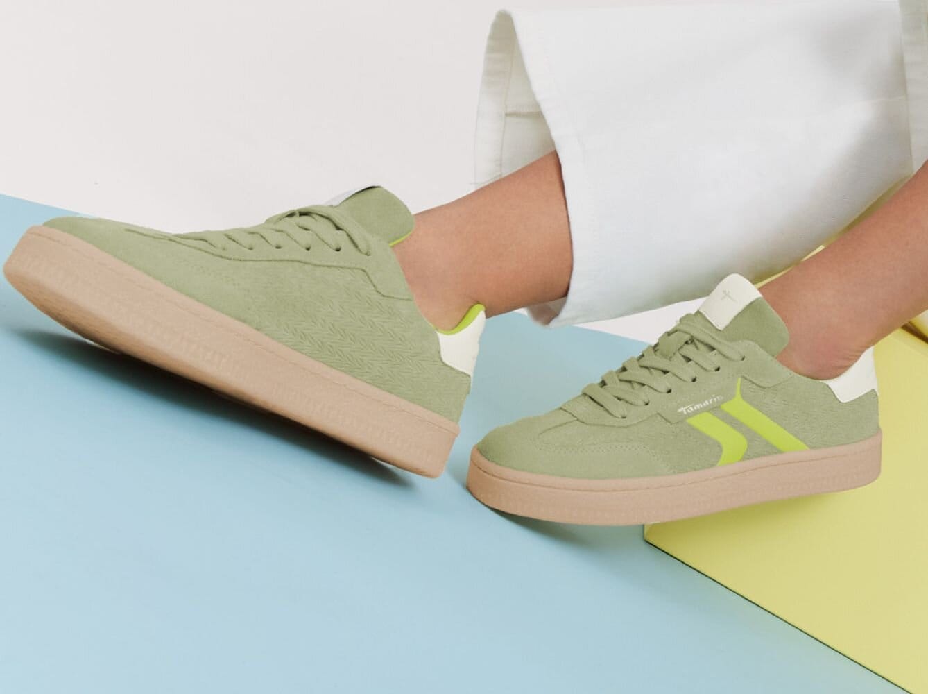 Sneakers i nyanser som ljusblått, mintgrönt, puderrosa och sandbeige ger ett mjukare uttryck än helvitt men är fortfarande enkla att matcha. Ofta kombineras pastellerna med vita sulor eller naturfärgade detaljer, vilket gör skorna både stilrena och användbara i vardagen.