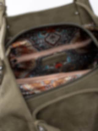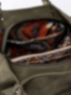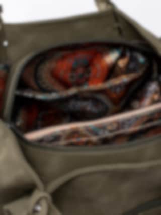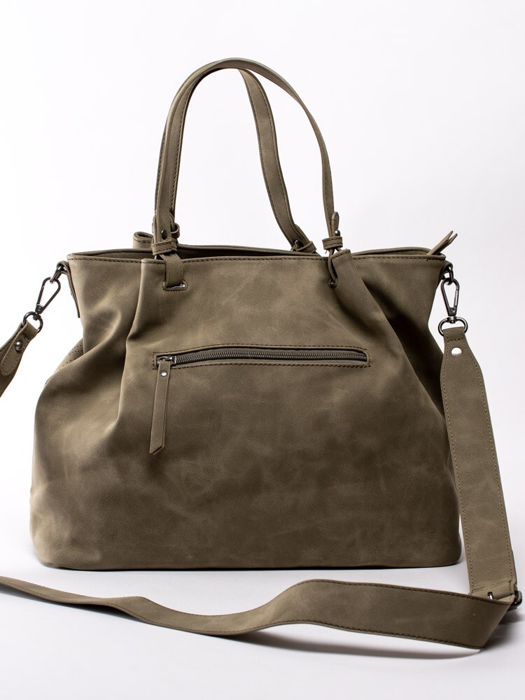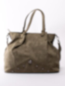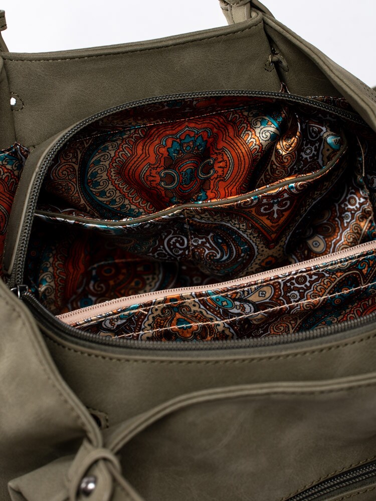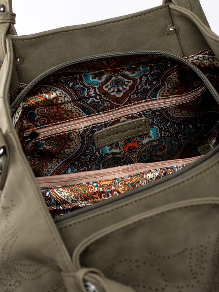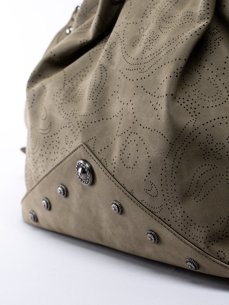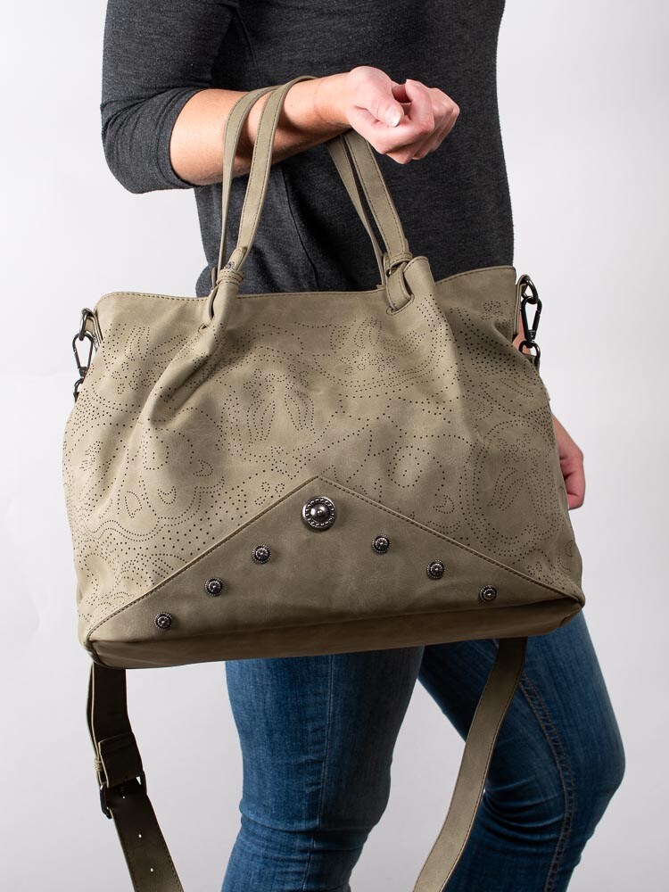 Mörkgrön stor handväska från Ulrika Design tillverkad i veganskt läder med dekorativ perforering. Stora, runda nitar i metall som detalj i botten. Stor väska så du får plats med alla dina tillhörigheter och till och med lite till. Två handtag och avtagbar axelrem som går att justera efter önskad passform. Ytterfack med dragkedja på baksidan där du kan lägga saker du behöver komma åt snabbt. Mörkgrön dragkedja som öppning och stängning av väskan. Huvudfack med brunt foder i textil med massa mönster försett med en ficka som avdelar, mindre ficka som kan förslutas med dragkedja och två fack.