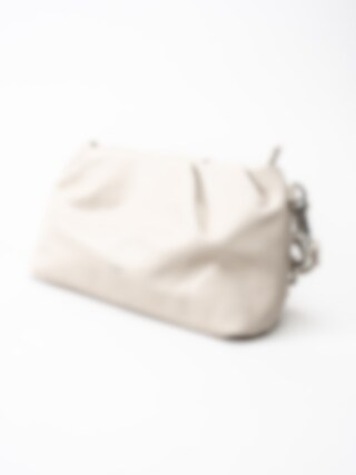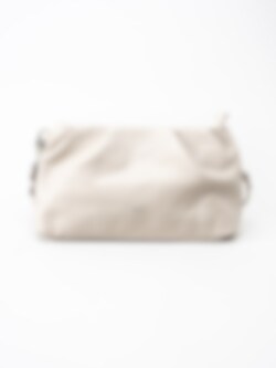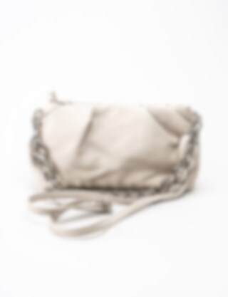 Beige väska med kedjerem från Ulrika. Väskan har en ficka med dragkedja och två öppna fack.