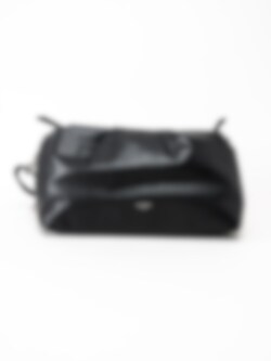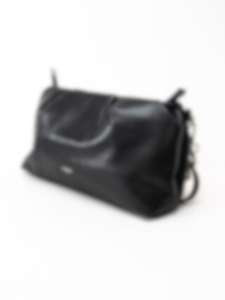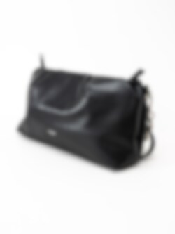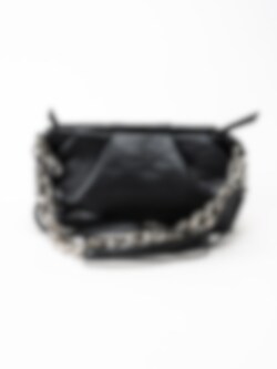 Svart väska med kedja från Ulrika. Väskan har en ficka med dragkedja och två öppna fack.